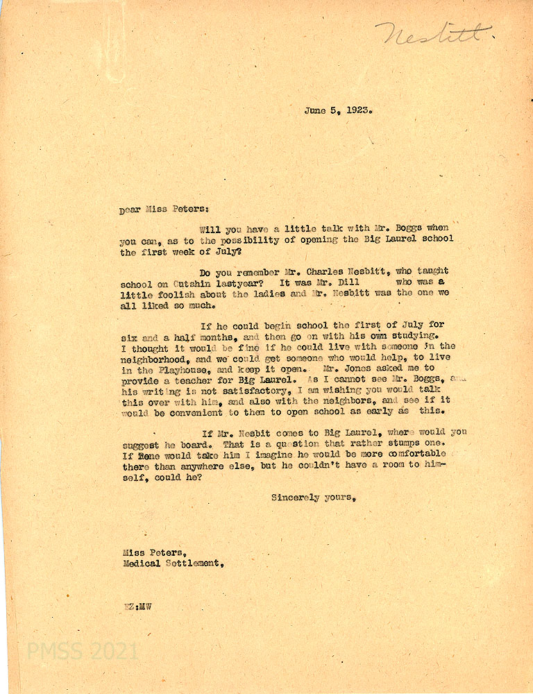 [014] June 5, 1923. To Miss Peters, Medical Settlement, from EZ (Zande), asking if Peters would talk with Mr. Boggs and the neighbors about opening the BIg Laurel school the first week of July; asks about where Nesbitt could board.