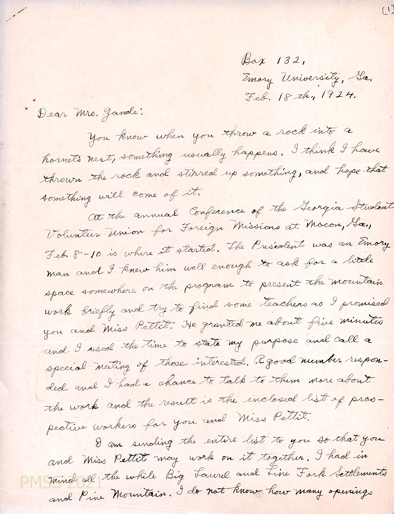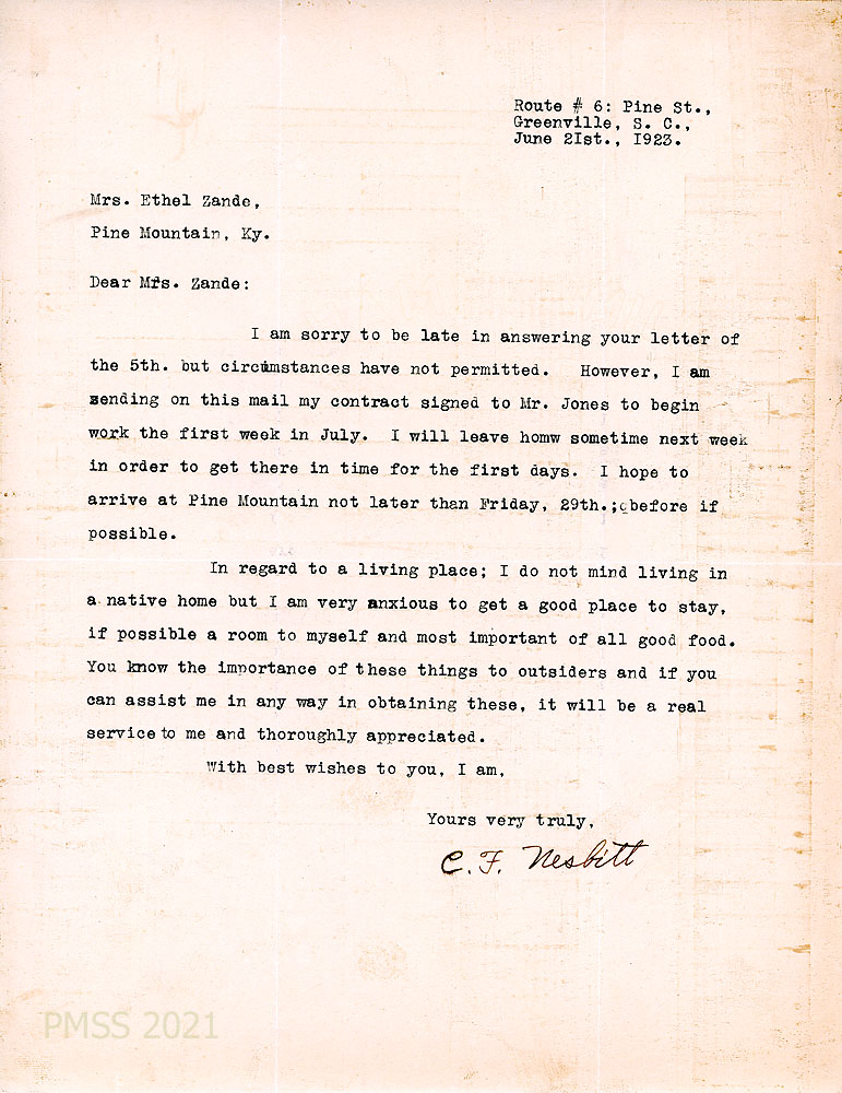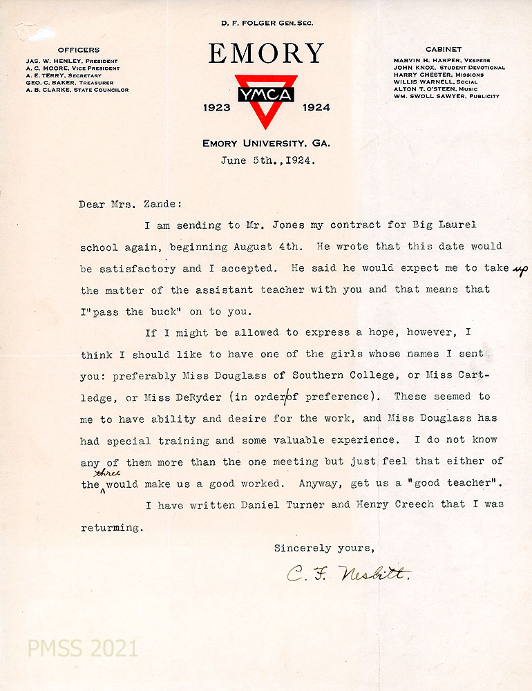 TAGS: Charles F. Nesbitt, correspondence, YMCA of the Citadel, Military College of South Carolina, Katherine Pettit, Ethel de Long Zande, rural schools, Medical Settlement at Big Laurel, Emory University, Mr. and Mrs. Henry Creech, teacher prospects, theological seminary, A.C. Jones, Harlan County Superintendent of Schools, Aileen Lewis