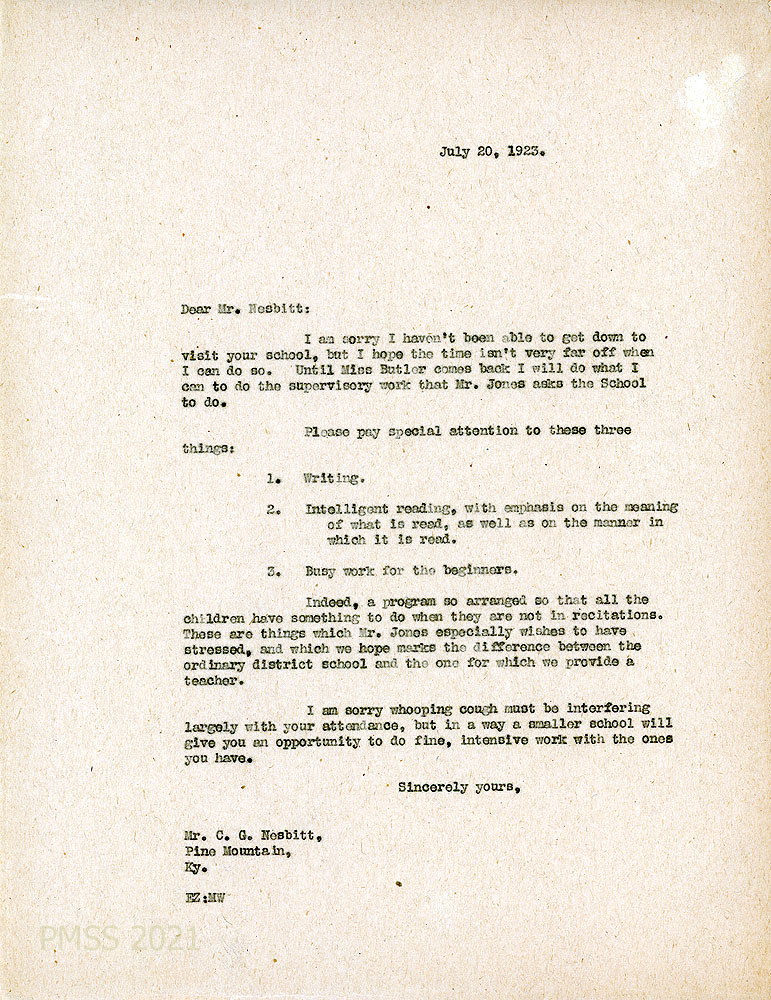 [018] July 20, 1923. To Nesbitt at Pine Mountain, KY, from EZ (Zande), who apologizes for not visiting his school yet. “Until Miss [Marguerite] Butler comes back I will do what I can to do the supervisory work that Mr. Jones asks the School to do.” Asks Nesbitt to emphasize writing, “intelligent reading” and “busy work for the beginners.” Regrets that whooping cough is affecting attendance “but in a way a smaller school will give you an opportunity to do fine, intensive work with the one you have.”