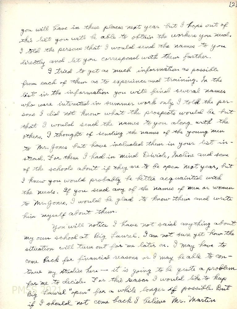 [026a], [026b] [date? PAGE 1 IS MISSING.] Pages 2 and 3 of a letter to [?] from Nesbitt, who has sent names of prospects for PMSS teaching positions. He is indecisive about returning to Big Laurel for financial reasons or continue his studies. Suggests the best prospects on the list. Asks for Pine Mountain Notes.