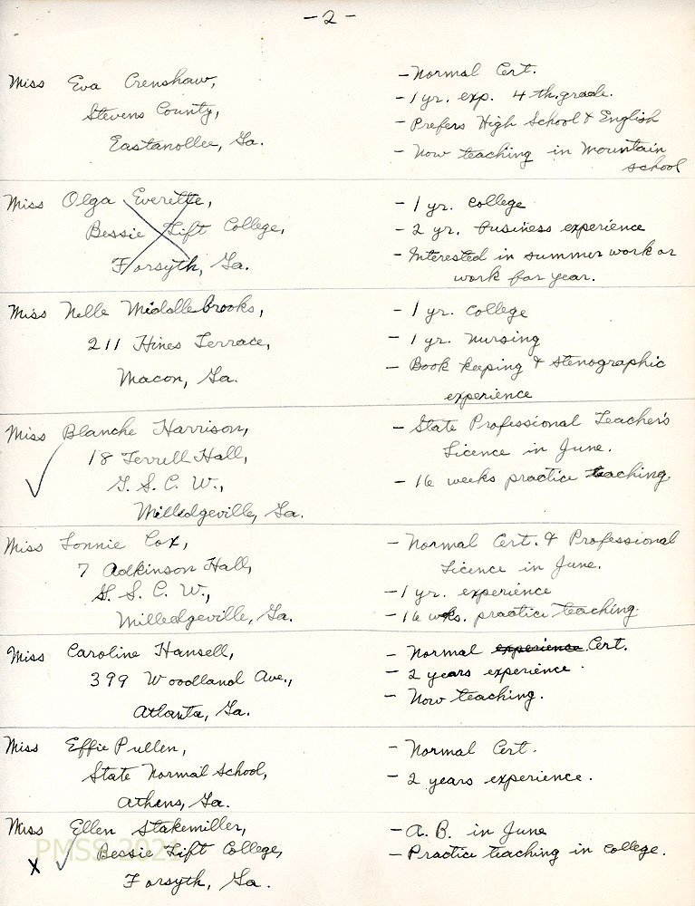 [027], [027a] [date? PAGE 1 IS MISSING.] Pages 2 and 3 of list of prospects for PMSS teaching positions with their addresses, education and experiences.