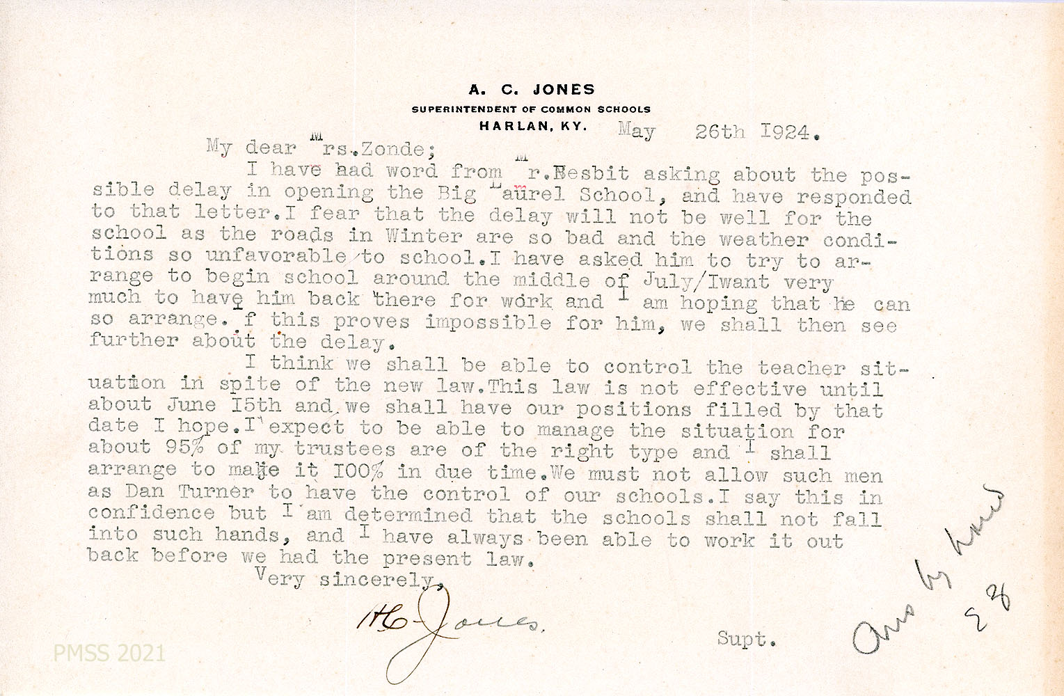 [034] May 26, 1924. To Zande from A.C. Jones, who declined Nesbitt’s request to delay in opening Big Laurel school “as the roads in winter are so bad….I want so bad to have him back there for work and I am hoping that he can so arrange” to begin in the middle of July. Explains how the “teacher situation” can be handled before the new law takes effect.