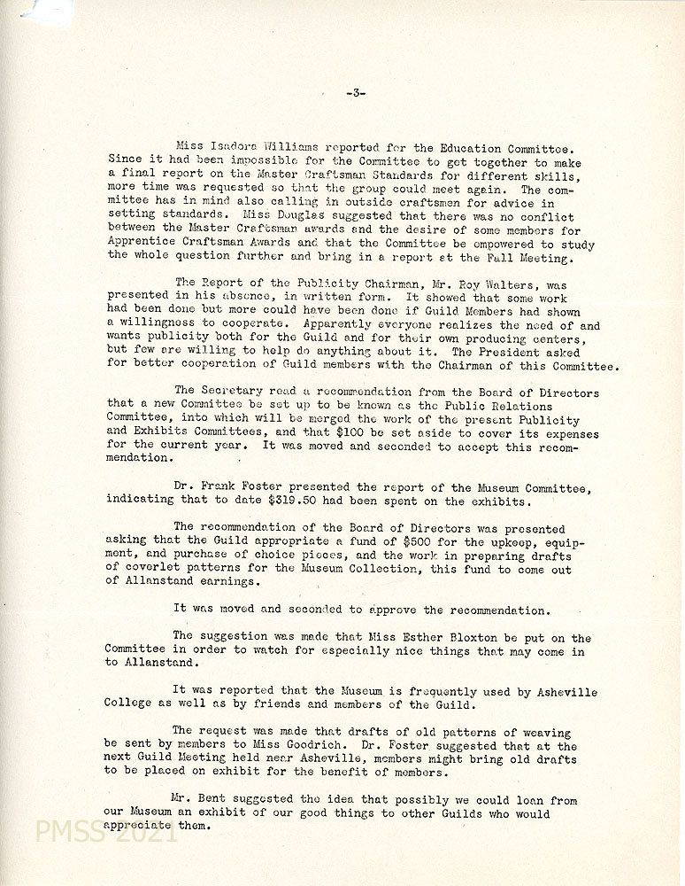 [003] Fall 1941 Minutes, page 3. The group discussed displaying “certain choice pieces from the Allanstand Shop in the museum on permanent exhibit.” Presentation of reports continued: Big Meadows Shop. (The Guild had entered into a venture with the shop “because we thought it important to cooperate with the Park Service; there are larger opportunities ahead if we can make the shop a success.”)