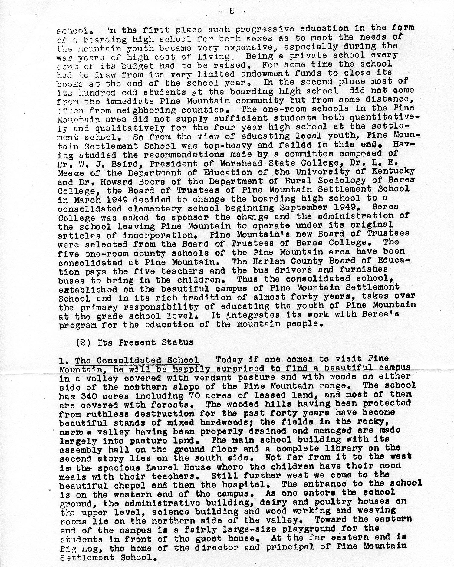 The brief eleven-page survey conducted in December of 1951, by Chang, an employee of Berea College, was made at the request of Dr. Francis S. Hutchins, President of Berea who was recently assigned President of the Pine Mountain Settlement School Board of Trustees. The study was necessitated by the dire financial situation of the boarding school brought about by the shift of educational programs within the geographic region and the evolving post-war economics. Cooperative and consolidated schools, more commonly known as Community Schools, were seen as new and promising educational models. In 1951 Pine Mountain joined with the Harlan County School system in the adoption of the new consolidated school model. The shared responsibility brought much-needed revenue to the settlement school from the Harlan County Board of Education and enabled continuing maintenance of the large infrastructure of the settlement. Teacher’s salaries, bus drivers, and bus maintenance, as well as rental income for the classroom space paid through the Harlan County Board of Education, significantly eased this difficult transition period for the School.