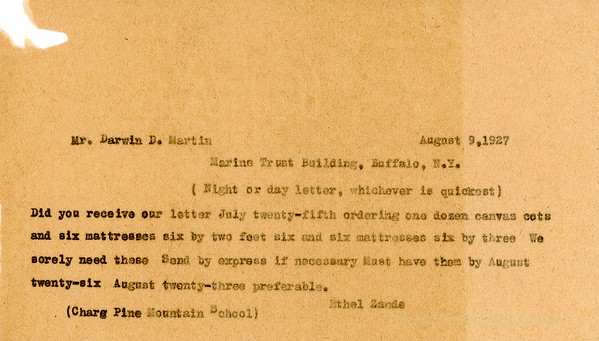 053 August 9. Ethel Zande to Martin. Copy of a telegram asking for the canvas cots and six mattresses.