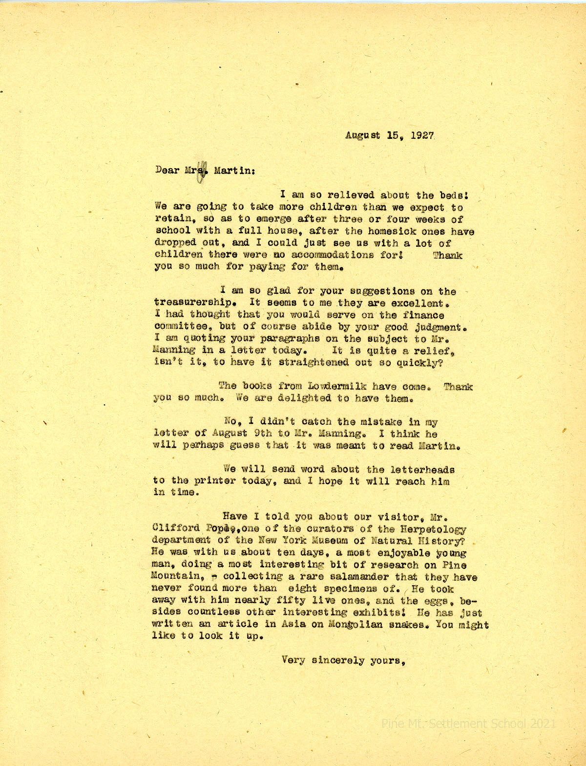 056 August 25. (Unsigned, likely Zande) to Martin. Appreciates the cots, his paying for them, his suggestions on the treasurership, and the books from Lowdermilk. Tells about Mr. Clifford Pope, “one of the curators of the Herpetology department of the New York Museum of Natural History” who is visiting PMSS to collect a rare salamander.
