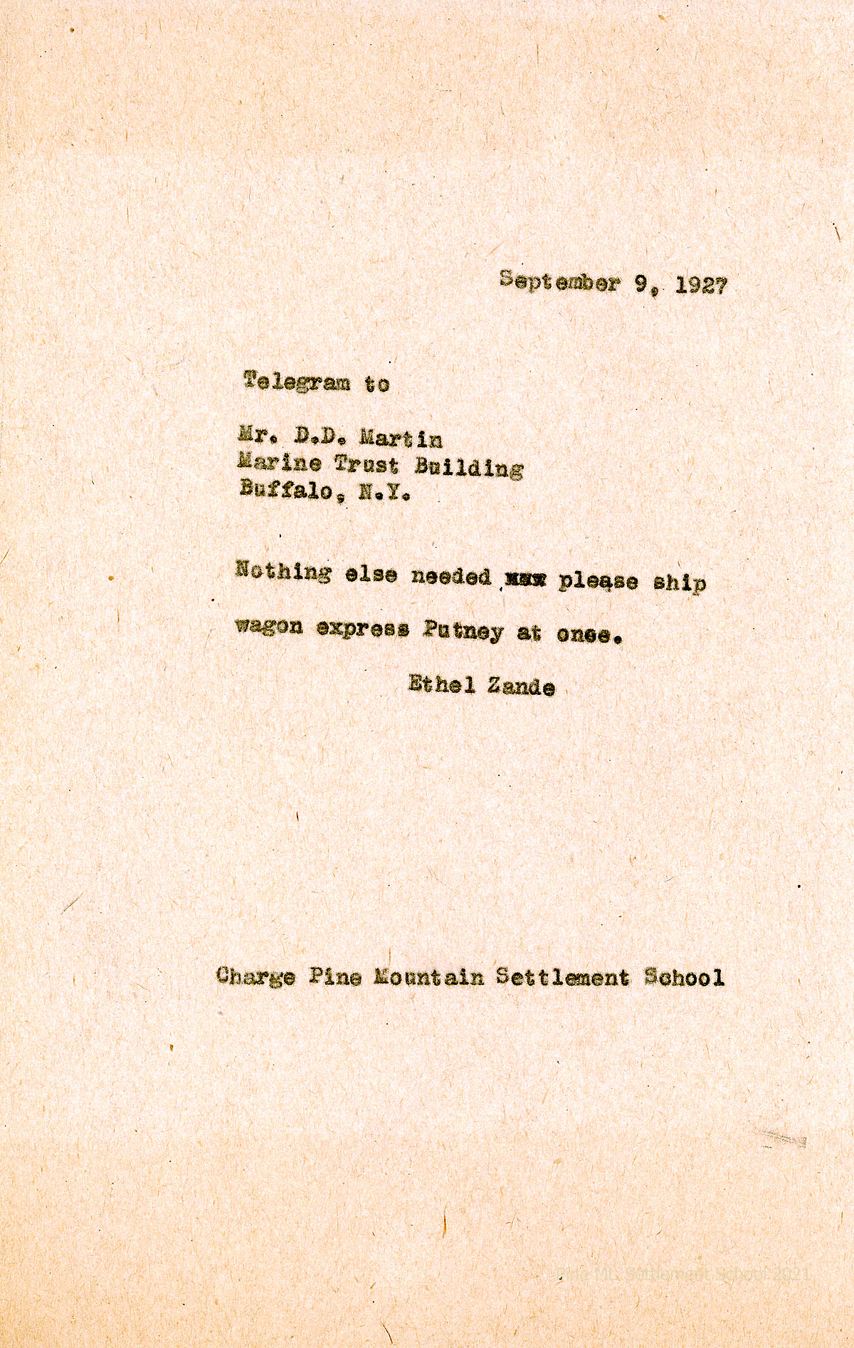 064 September 9. Carbon copy of telegram from Ethel Zande to D.D. Martin: “…please ship wagon express Putney at once.”