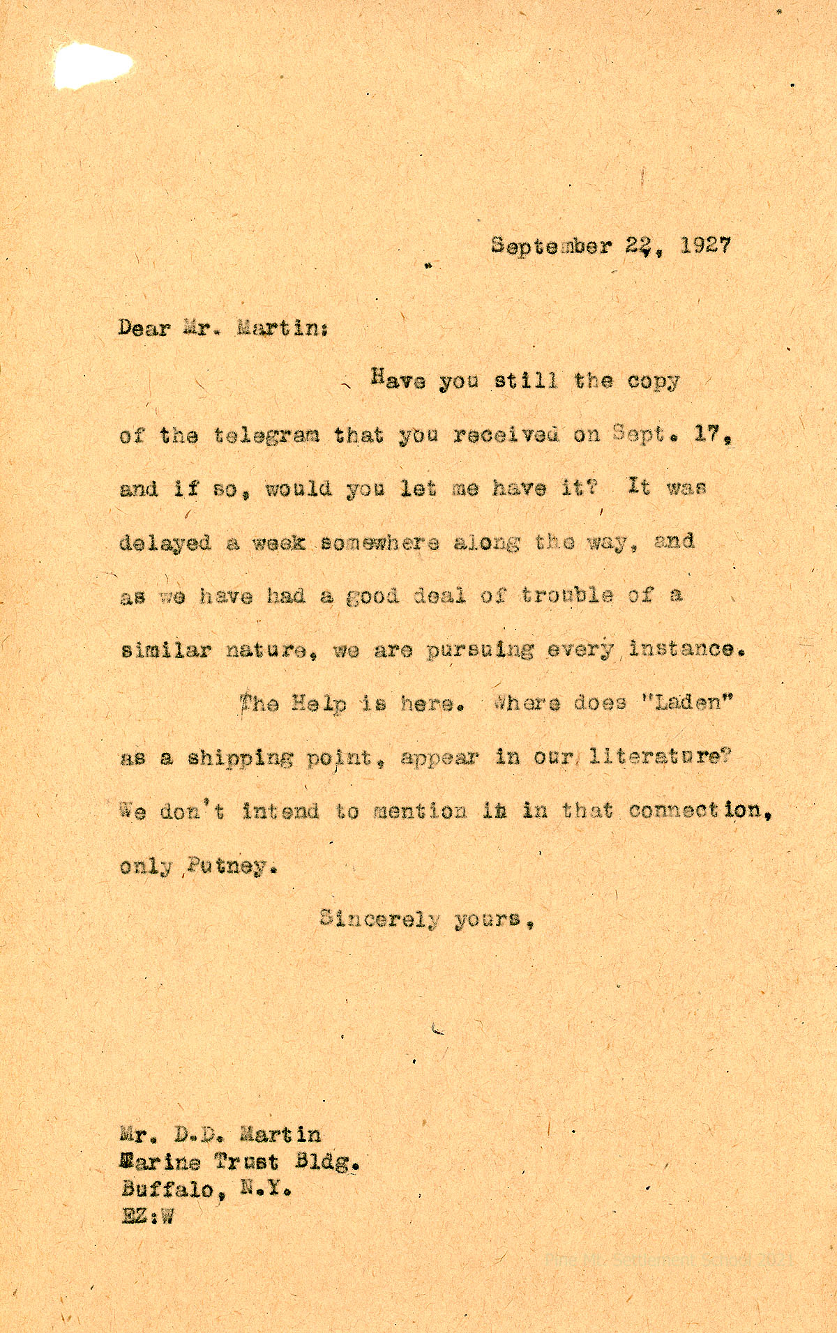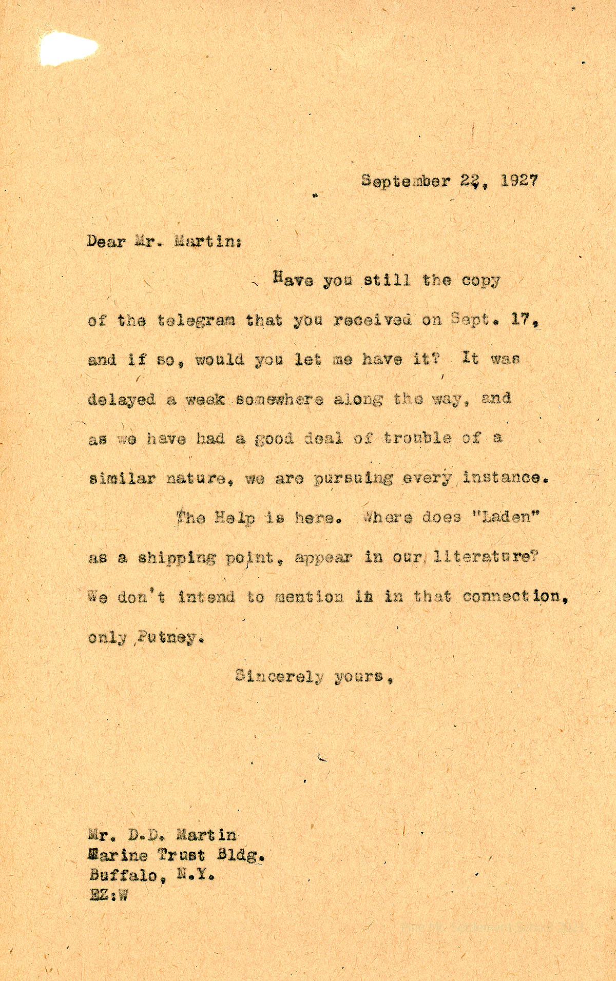 068 September 22. EZ (Zande) to Martin, asking him to return the copy of the telegram, in order to pursue their troubles with the telegraph company. Use only Putney as the shipping point.