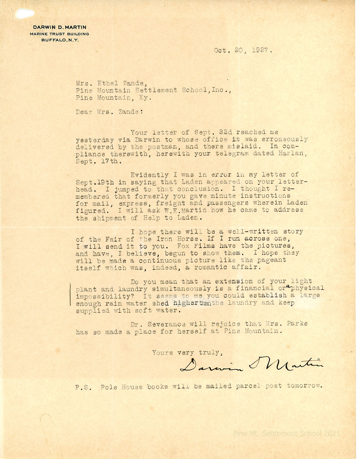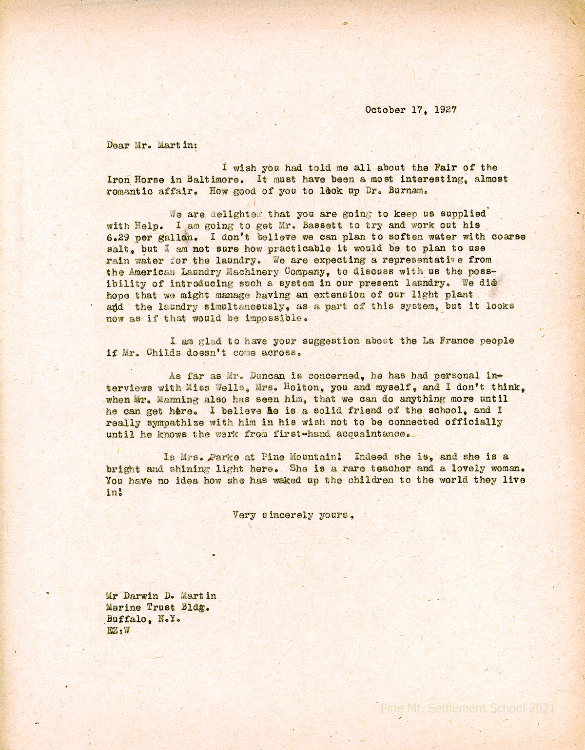 TAGS: Darwin D. Martin 1927, correspondence 2, Larkin Company, Ford dump-truck, Reservoir, Delco generator, moonlight schools, upright pianos, beechnuts, stoves, fire extinguishers, coal mine, Elizabeth Hench, Fair of the Iron Horse, American Laundry Machinery Company, Luigi Zande, forest fires, Martha Berry Schools