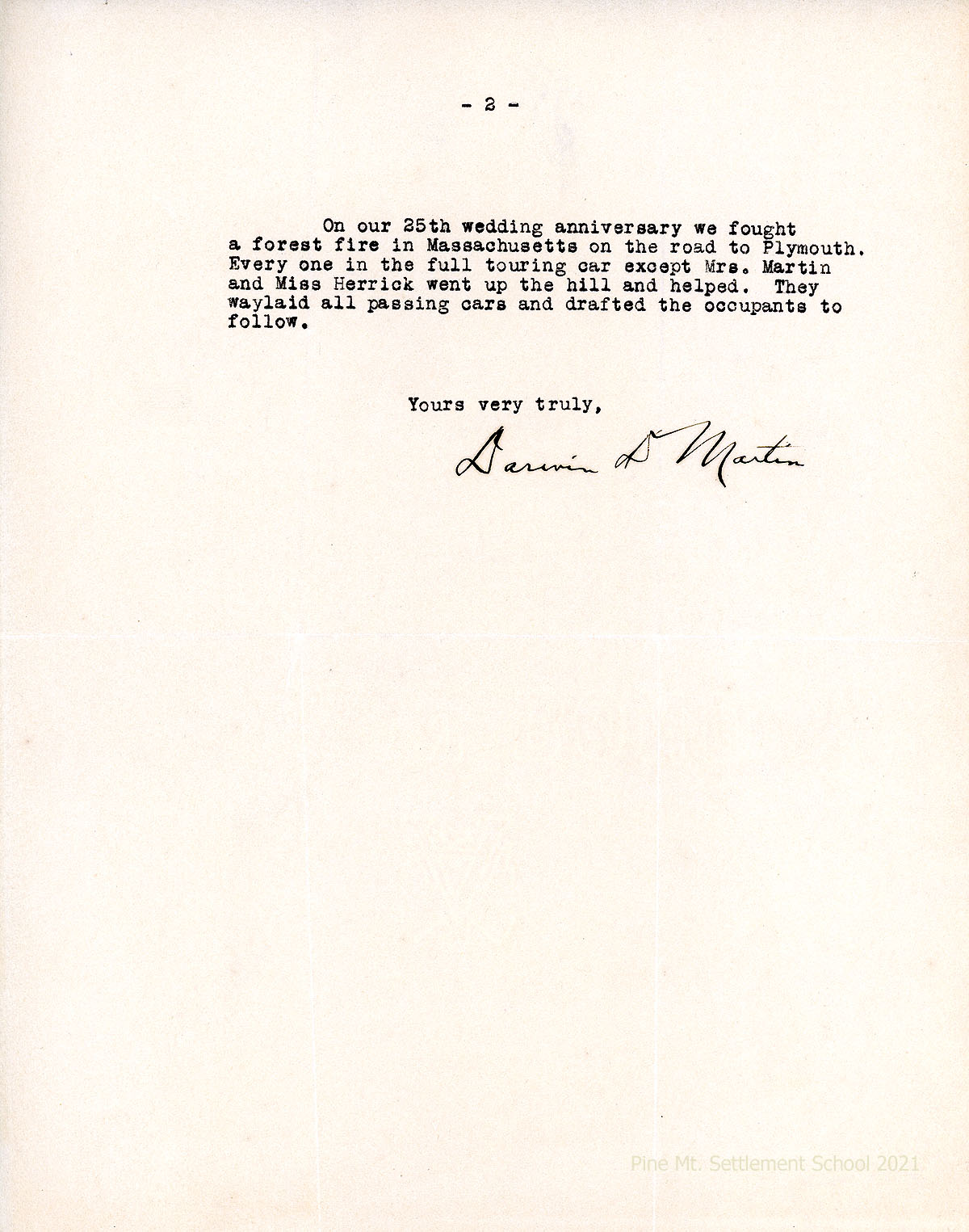 080 October 31. (Truncated, likely Zande) to Martin, explaining the “laundry situation”: The American Laundry Machinery representative visited and will take details back to their engineer at the home office. The engineer will decide whether PMSS should build a small laundry building or use the washing room for the machine.; and whether a gasoline or steam engine should be used. She feels that it’s “much more feasible to soften the laundry water than to catch (and filter) rainwater.” Mentions Luigi Zande’s effort to solve “our light problem”: to set up a second Delco unit “and divide the strain.” The Pole House books arrived; everyone, including students, is fighting forest fires.