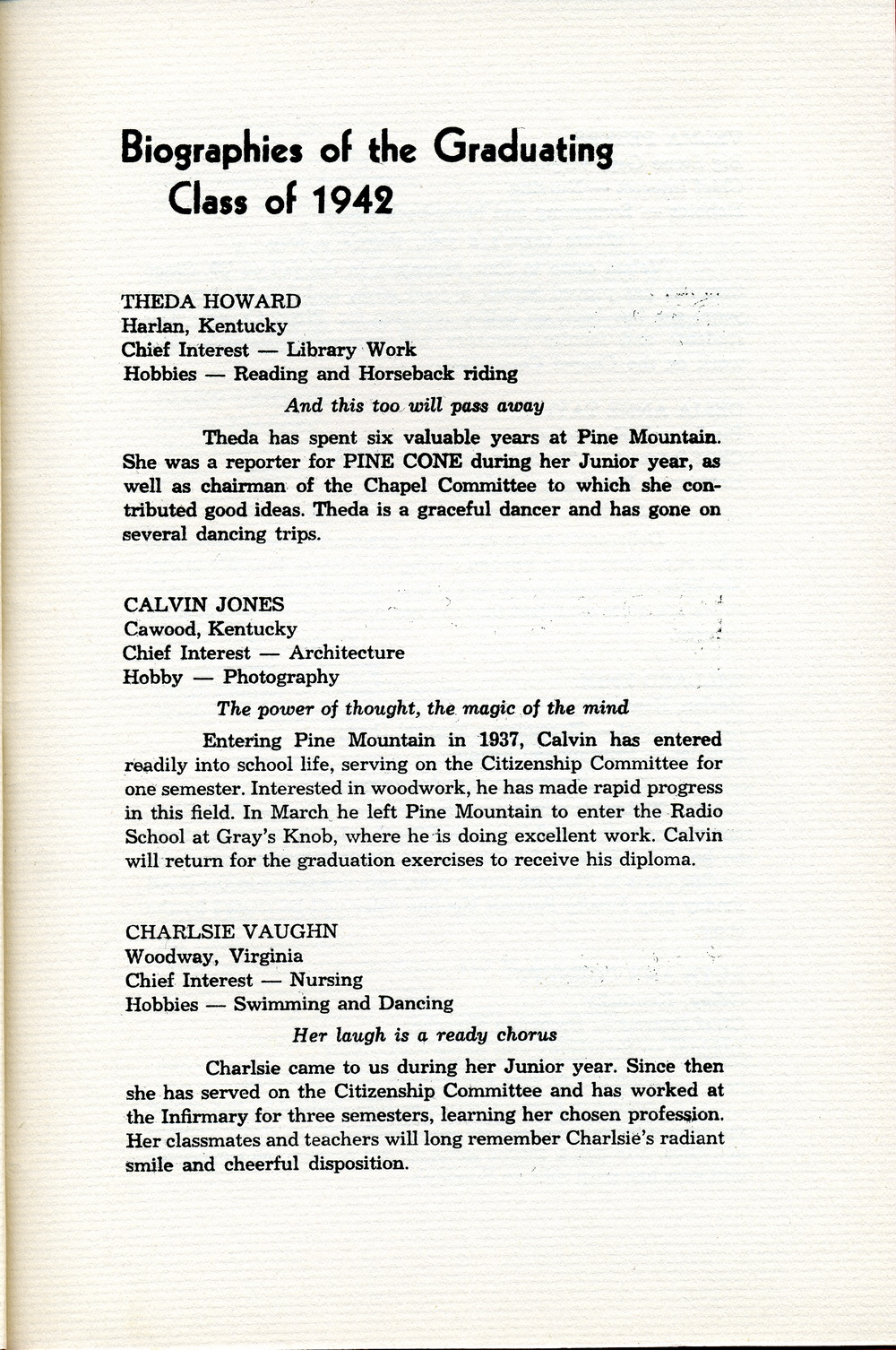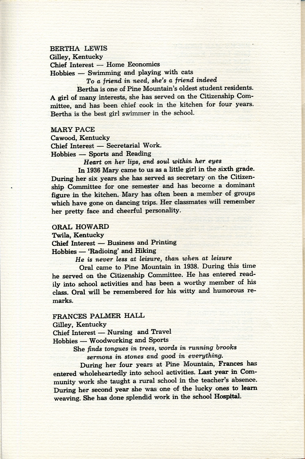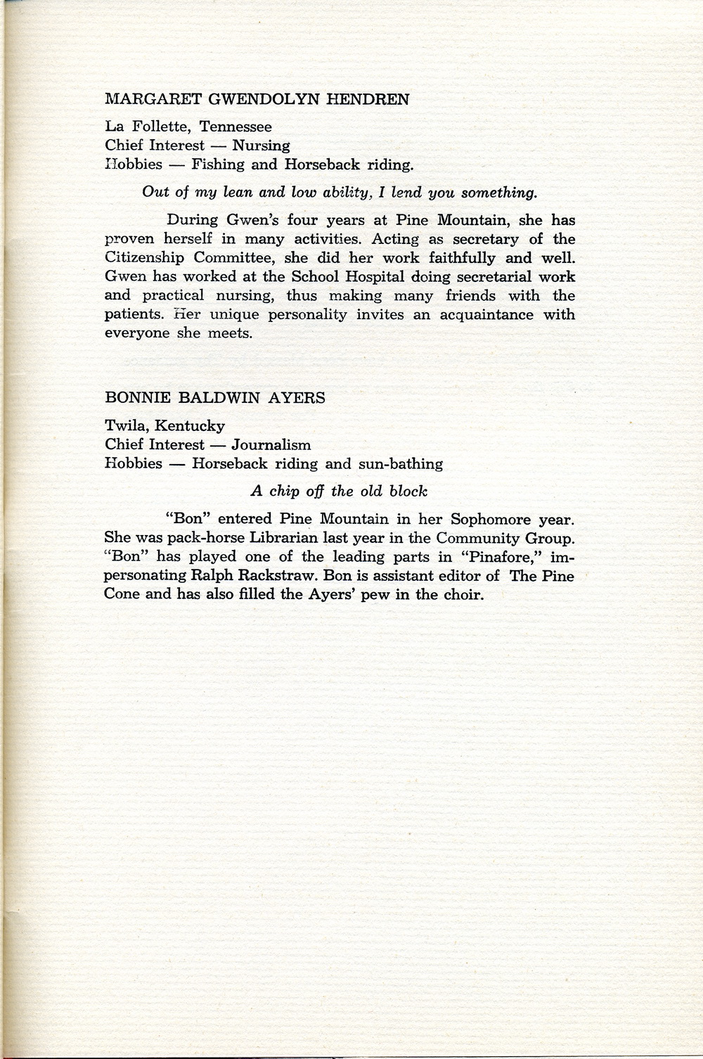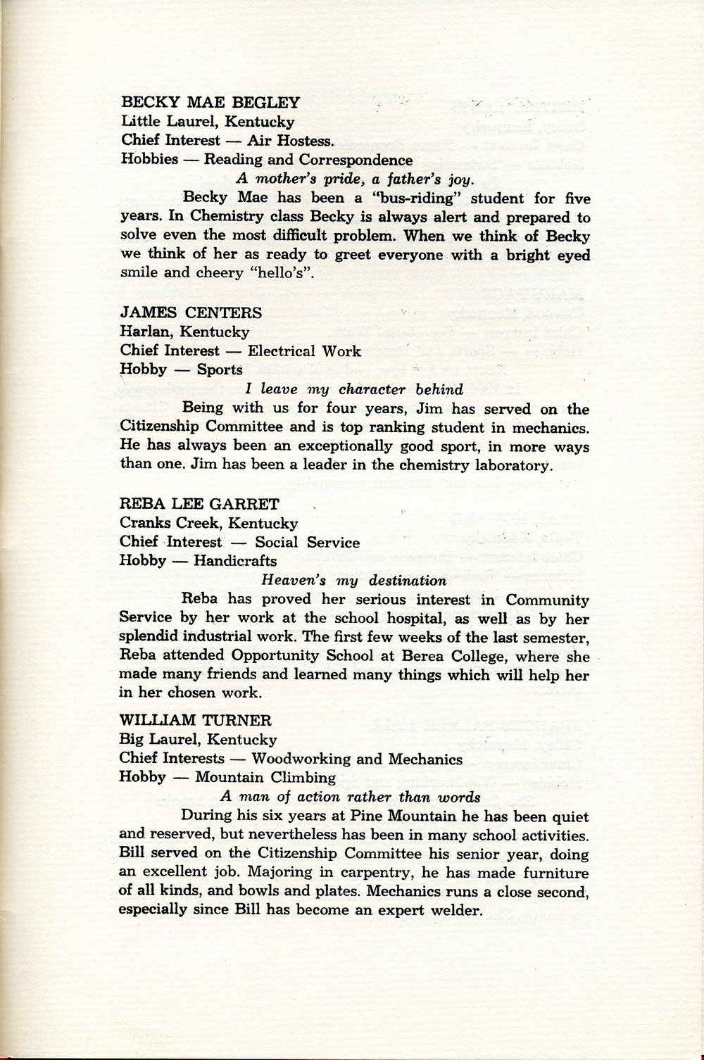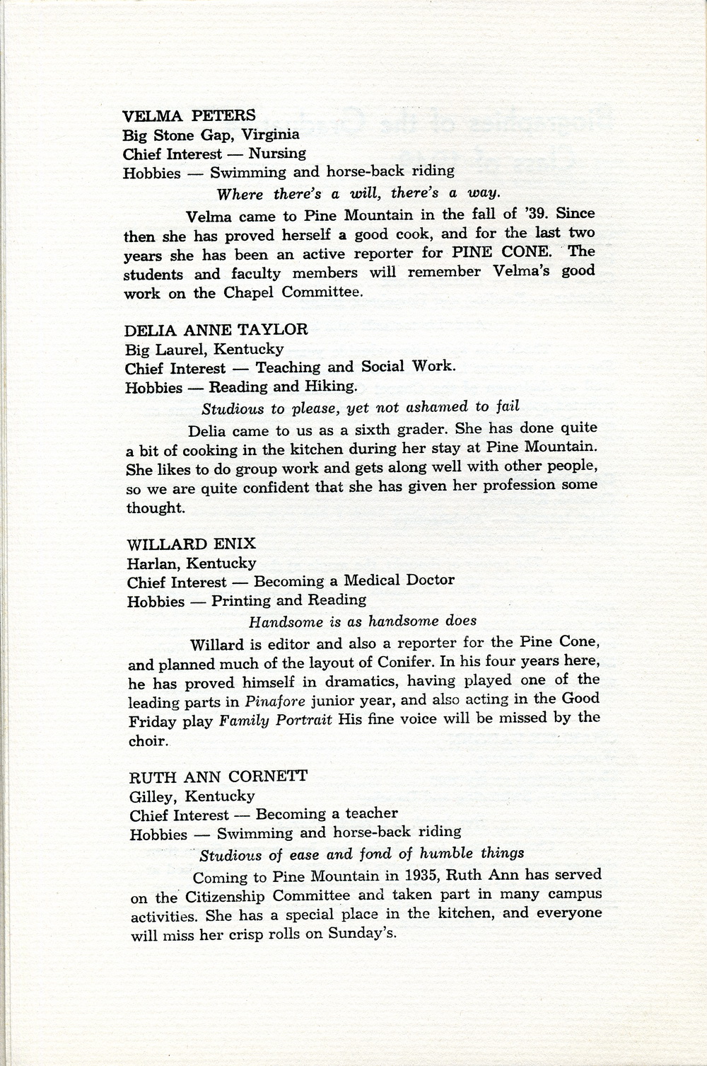 Conifer’s coverage of each student included the student’s name, hometown, chief interest and hobbies followed by a paragraph describing his or her experiences at Pine Mountain Settlement School.