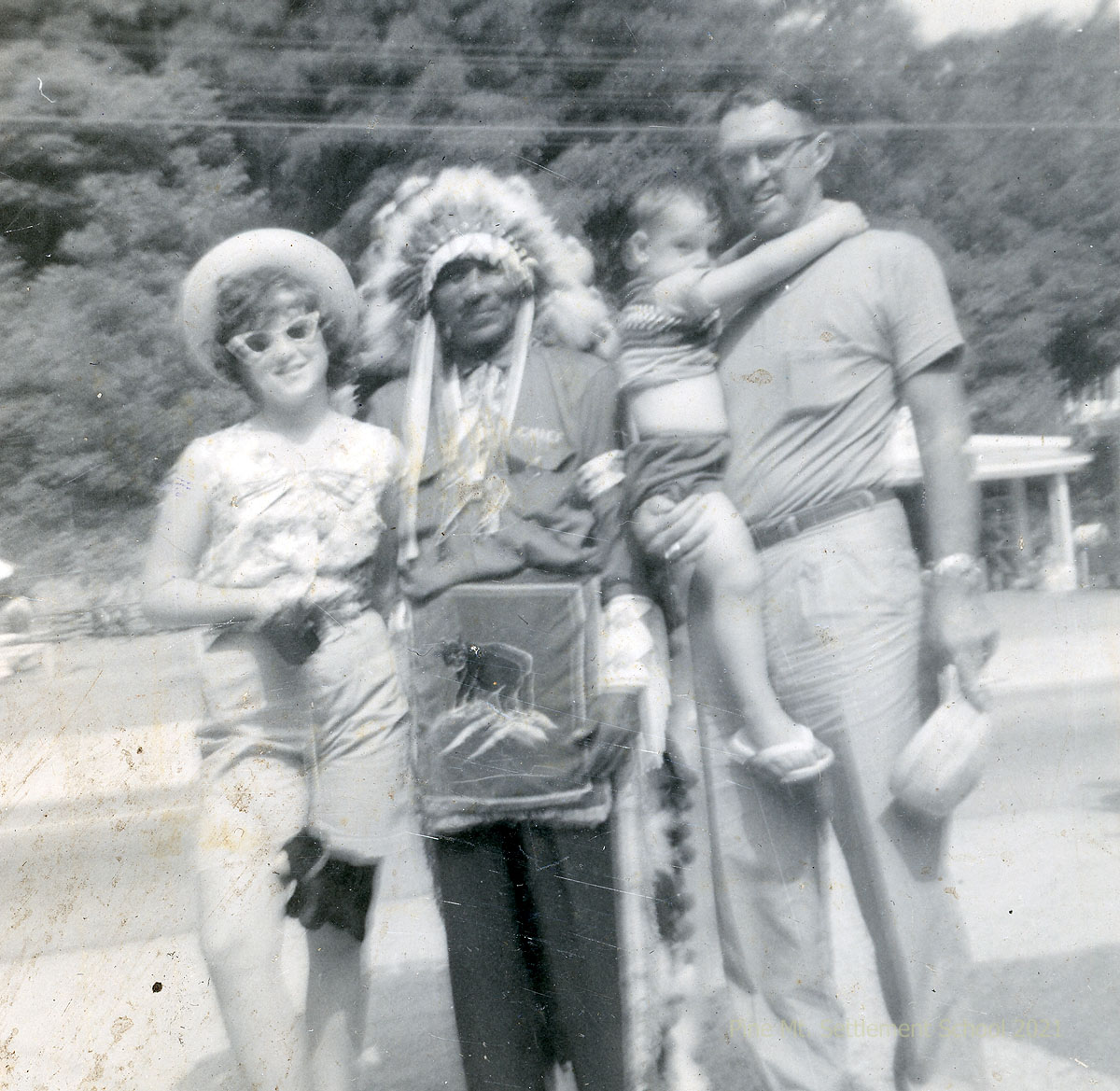 - 396 [Cherokee, NC] “Left to Right: Linda McIntyre age 12, Indian, Gordon McIntyre age 4, Daddy (Buster McIntyre).” [creech_columbus_3_396]