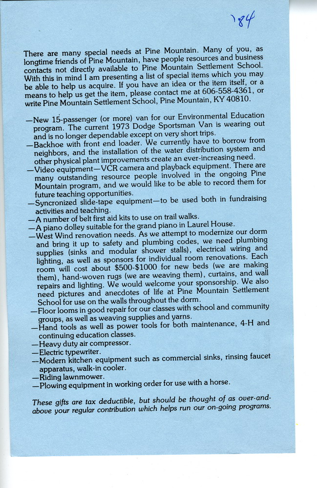 There are many special needs at Pine Mountain. Many of you, as longtime friends of Pine Mountain, have people resources and business contacts not directly available to Pine Mountain Settlement School. With this in mind I am presenting a list of special items which you may be able to help us acquire. If you have an idea or the item itself, or a means to help us get the item, please contact me at 606-558-4361, or write Pine Mountain Settlement School, Pine Mountain, KY 40810.