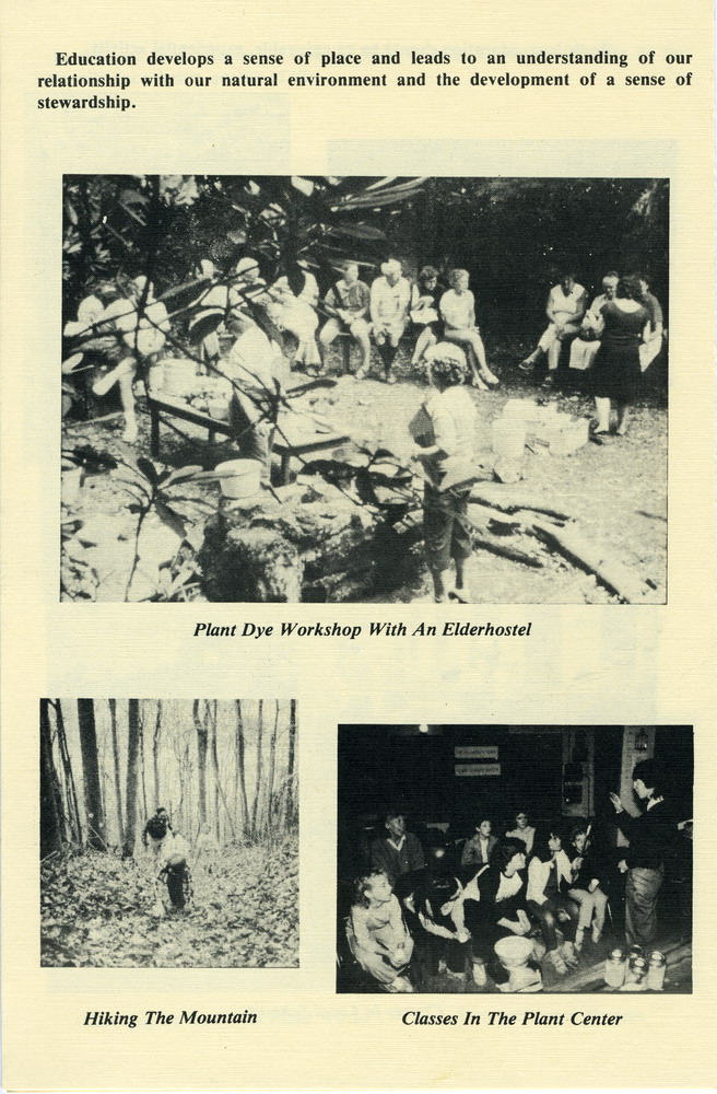 [Photographs with the following captions: “Plant Dye Workshop With An Elderhostel,” “Hiking The Mountain,” and “Classes In The Plant Center.”]