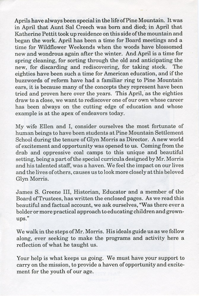 Aprils have always been special in the life of Pine Mountain. It was in April that Aunt Sal Creech was born and died; in April that Katherine Pettit took up residence on this side of the mountain and began the work. April has been a time for Board meetings and a time for Wildflower Weekends when the woods have blossomed new and wondrous again after the winter. And April is a time for spring cleaning, for sorting through the old and anticipating the new, for discarding and rediscovering, for taking stock. The eighties have been such a time for American education, and if the buzzwords of reform have had a familiar ring to Pine Mountain ears, it is because many of the concepts they represent have been tried and proven here over the years. This April, as the eighties draw to a close, we want to rediscover one of our own whose career has been always on the cutting edge of education and whose example is at the apex of endeavors today.