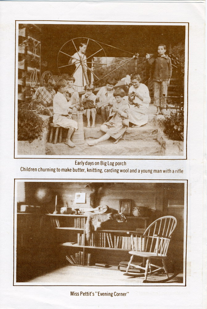 Miss Pettit, a native Kentuckian, was a woman of action. She strongly believed in learning by doing. In seeking funds to build Big Log, she related the difficulties to surmount. “Hundreds of logs donated were living trees on the ridgesides, which must be measured, marked, cut, hewn, squared by hand, snaked down the slopes by ox team and then floated or hauled to the school grounds. Stone for the foundation and chimneys must be quarried from the cliffs. Shingles for the roof must be hand-riven with fro and mallet. Window frames and glass, nails, lime for the mortar chinking had to be hauled, a three day journey from the railroad, across five ridges, along a dozen rocky creek and branch beds. Furniture must be made in the school shop.” This entire operation was mainly supervised by Miss Pettit.