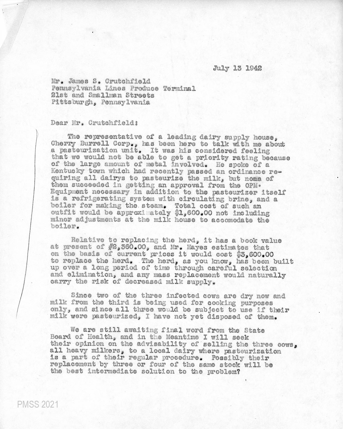 Mrs. Sarah Dugan followed up on July 11 regarding the pasteurization equipment and cautioned that because of the war (WWII) that the School would be competing with the needs for essential equipment for the armed forces. Further, she cautioned that the cost might be from two to three thousand dollars for new equipment. She then offered that it might be possible to obtain second-hand equipment and supplied the names of contacts.