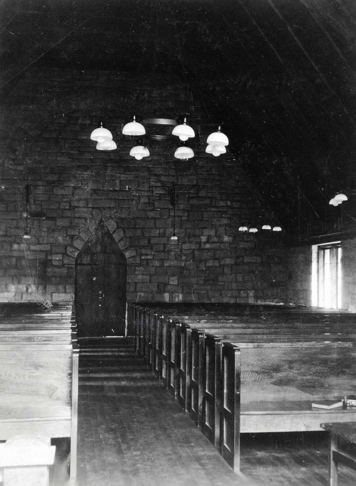 - Chapel. Interior view with lighting and east door before Holtkamp pipes. 1920s? [ii_chapel_0360a]