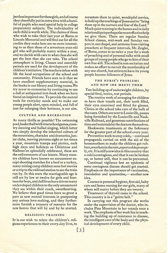 …subject less important for these girls, and of course they cheerfully put in extra time with a handful of pupils who need special help in college preparatory subjects. The individuality of each child is worth while. The claims of those who wish to take their last year at Berea or Lincoln Memorial [University] and will find use for all the credits they make here are no more interesting to us than those of a seventeen-year-old girl who will probably marry within a year, and we decide with care in what class she will get the best that she can take. The school atmosphere is living. Classes and assembly periods are used for the development of the children’s initiative. The teachers infuse with life the local occupations of the school and community. Friends have seen to it that we have excellent supplementary material, in the books in our library and living rooms. We try never to economize by continuing to use a dull or antiquated text-book when we have found an inspired one. To provide the mental tools for everyday needs and to make our young people alert, open-minded, and full of zest for enlarging their horizons, is our aim.