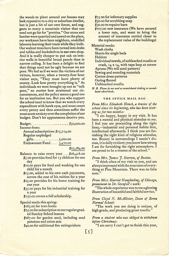 …the woods to plant around our houses may look expensive to a city or suburban dweller, but is just a bit of our own forest, and suggests to many a mountain visitor that one need not go far for “pretties.” Our stone and lumber were quarried and sawed on the place, our workmen have been neighbors, unskilled laborers learning their trade while they built. Our walnut trees have been turned into desks and tables and bookshelves in our own shop. And it is really cheaper to put oak on interior walls in beautiful broad panels than in narrow ceiling. It has been a delight to find that things need not be ugly because we are poor. We feel as if we were the victims of our virtues, however, when a twenty-four hour visitor says, “They must have plenty of money. Look how pretty everything is.” As individuals we were brought up not to “talk poor,” no matter how straitened our circumstances, and the policy seems a good one for an institution too. But you who support the school need to know that we watch every expenditure with hawk eyes, and must count every penny and then sometimes suffer the most acute anxiety over the completion of our budget. Don’t let appearances deceive you.