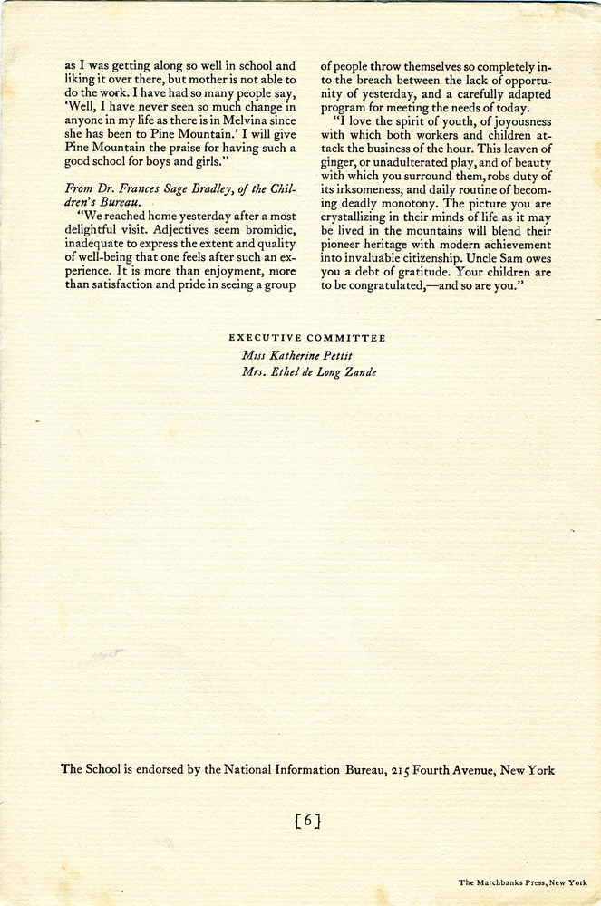 WORKERS returning to Pine Mountain say, “It’s a wonderful place to come back to!” Miss [Katherine] Pettit, who has just returned from a trip around the world, dreamed of for thirty years, said that in one day after her arrival three workers said to her, “You may have seen wonderful things, but nothing more interesting and thrilling than what is right at Pine Mountain.” The atmosphere in these opening weeks of school has no heavy perfunctoriness, as of a grind dutifully undertaken, but is charged with freedom and a sense of possibilities ahead. Of course, our students themselves are neither sophisticated nor jaded with luxuries, but there is among the workers a happy unanimity of aim, an inspiring feeling that “Eden ain’t all built yet,” and each one can have a whack at shaping it. Some of this may be due to our youth — elaborate red tape and ready-made system haven’t had time to grow, here — but we hope that, as the school grows older, it may never lose its young heart, its sense of the adventure of life and education, of the world, full of a number of things, offering treasures to us all.