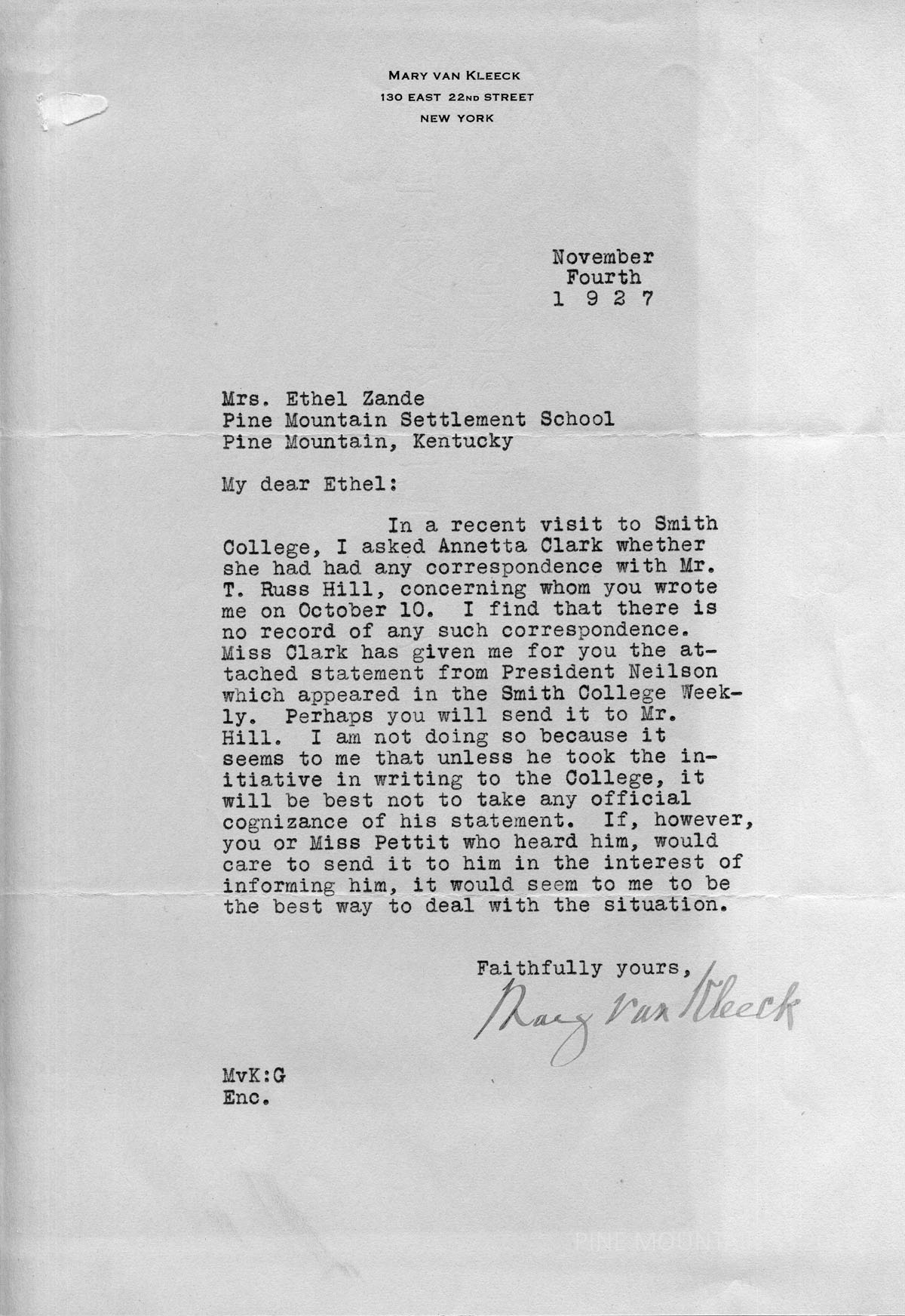 TAGS: administration general correspondence, 1927, Pine Mountain Settlement School, Harlan County KY, philanthropy, external correspondence, donors, equipment, visitors, educational programs, Appalachian folk life, built environment, inventory