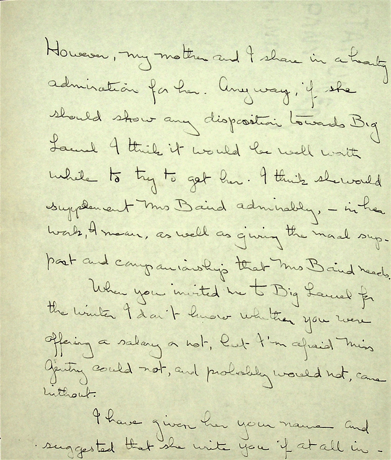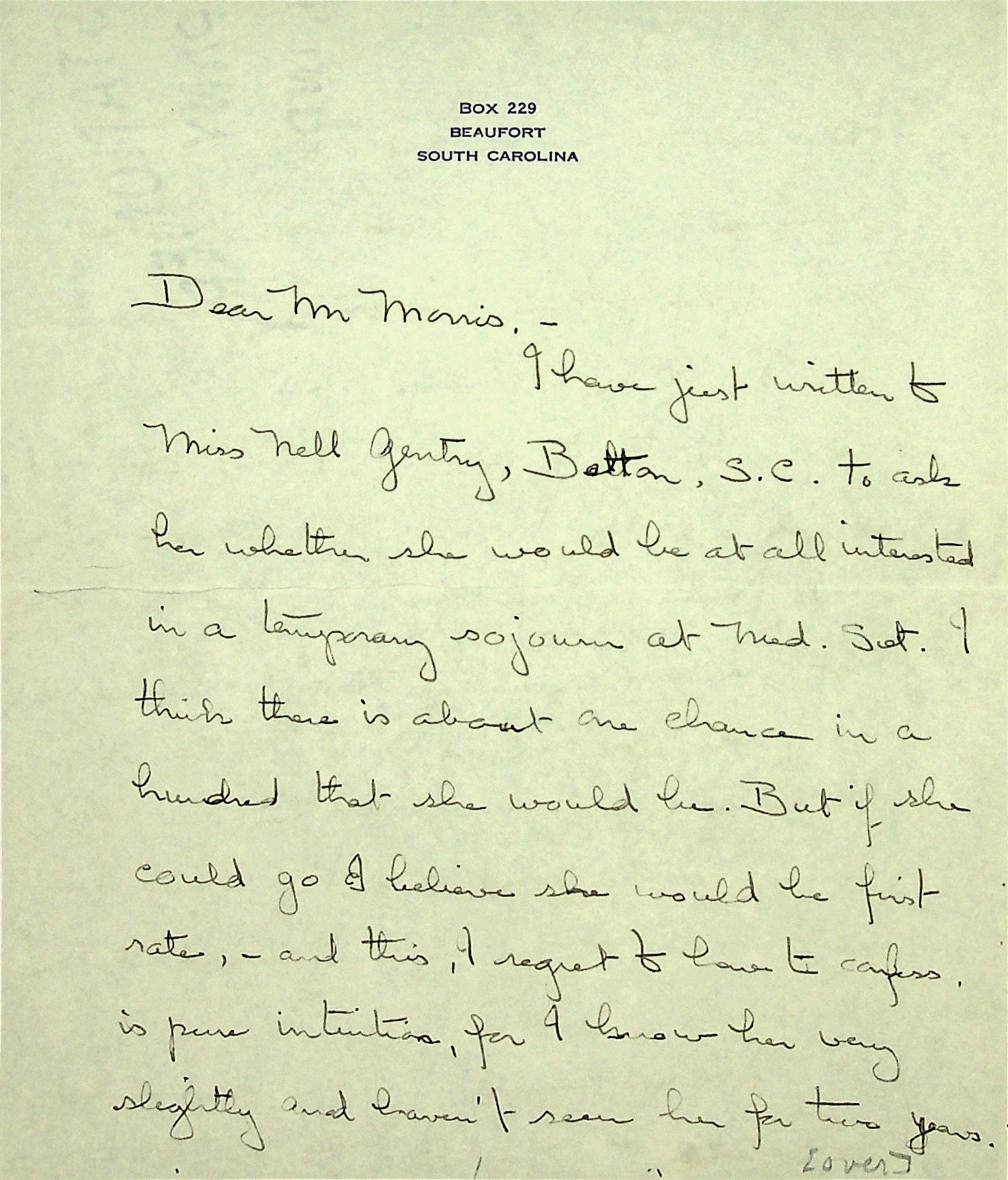 January 15, 1935. To Glyn Morris from Christensen at Beaufort, SC. Miss Christensen asked Mrs. Nell Gentry, Belton, SC, of her interest in working at Medical Settlement at Big Laurel & provided Morris with information about her.