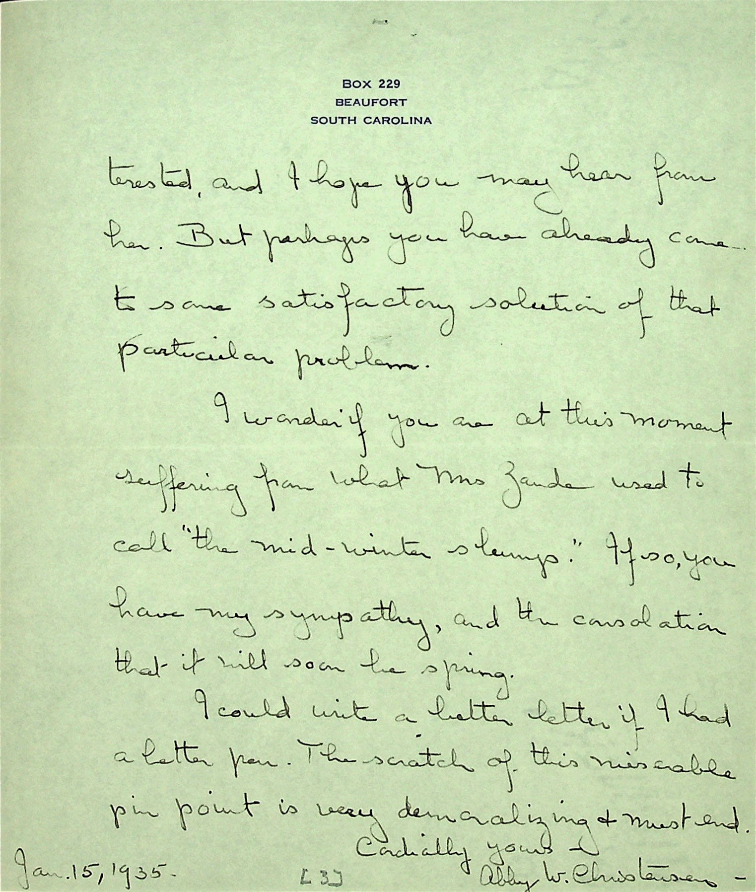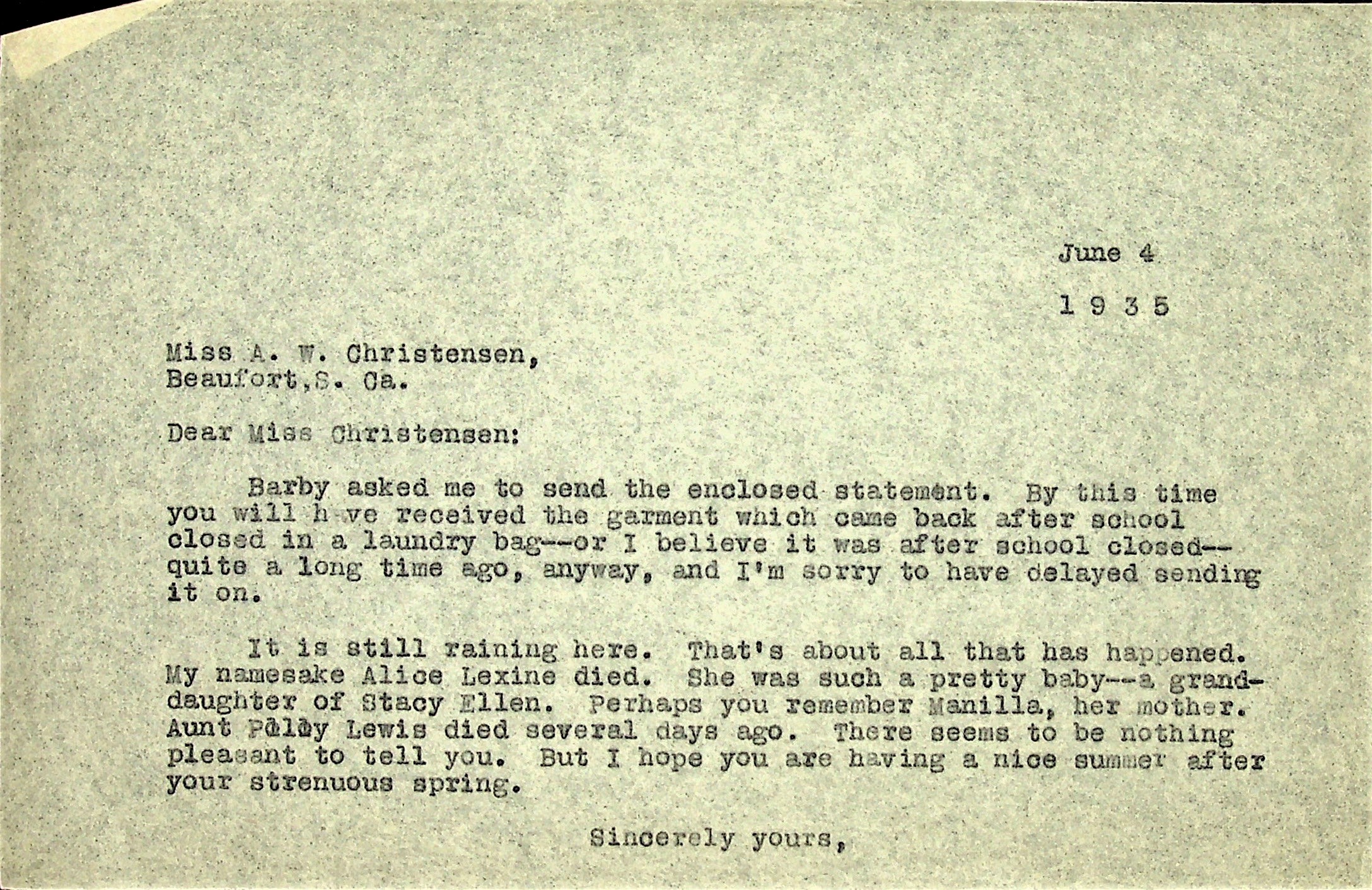 June 4, 1935. To Christensen at Beaufort, SC, from [unsigned, possibly Alice Cobb]. “My namesake Alice Lexine has died. She was such a pretty baby — a grand-daughter of Stacy Ellen, Perhaps you remember Manilla, her mother. Aunt Polly Lewis died several days ago.”