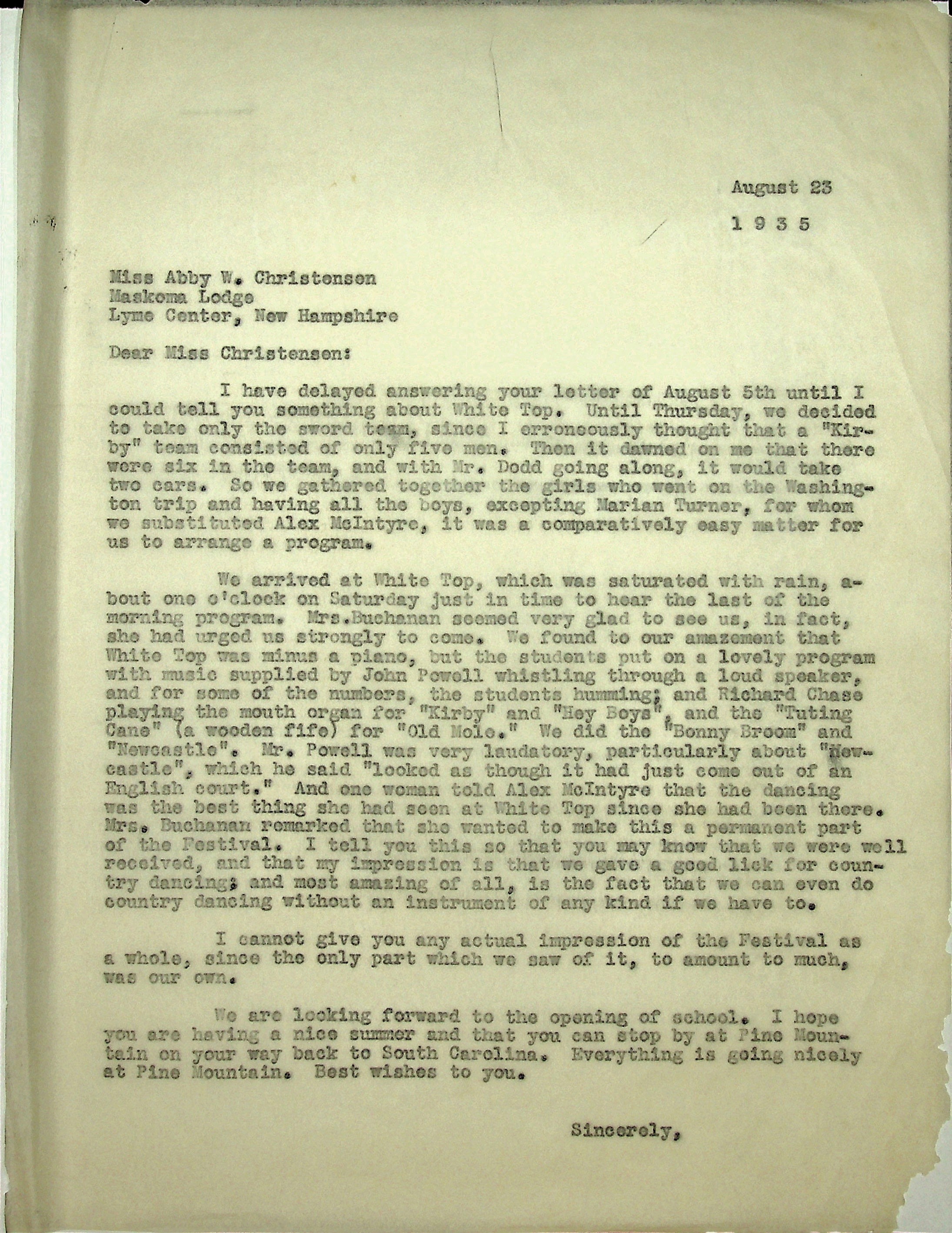 August 23, 1935. To Christensen at Maskoma Lodge (girls’ camp), Lyme Center, NH, from [unsigned, likely Morris]. Describes dance program that PMSS presented at the White Top Festival. In place of a piano, John Powell whistled “through a loud speaker” and Richard Chase played the mouth organ.