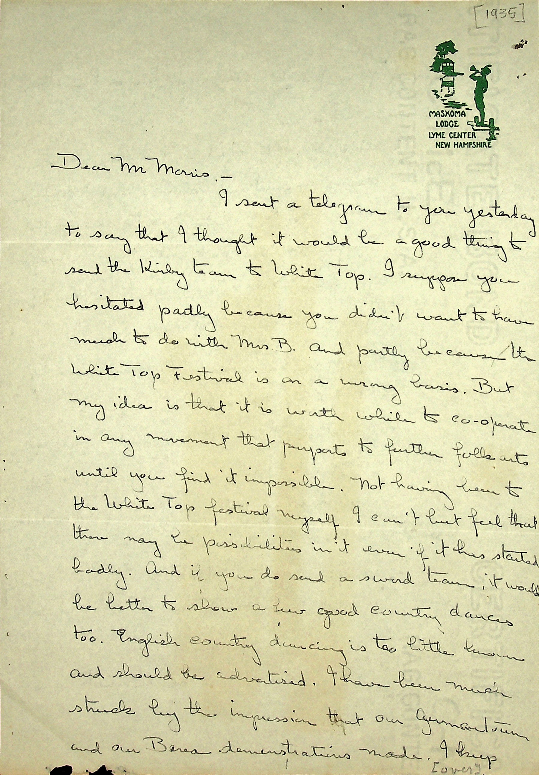 August 5, 1935. To Morris from Christensen at Maskoma Lodge (girls’ camp), Lyme Center, NH. Explains her thoughts about the publicity benefits of performing English Folk Dancing at the White Top Festival.