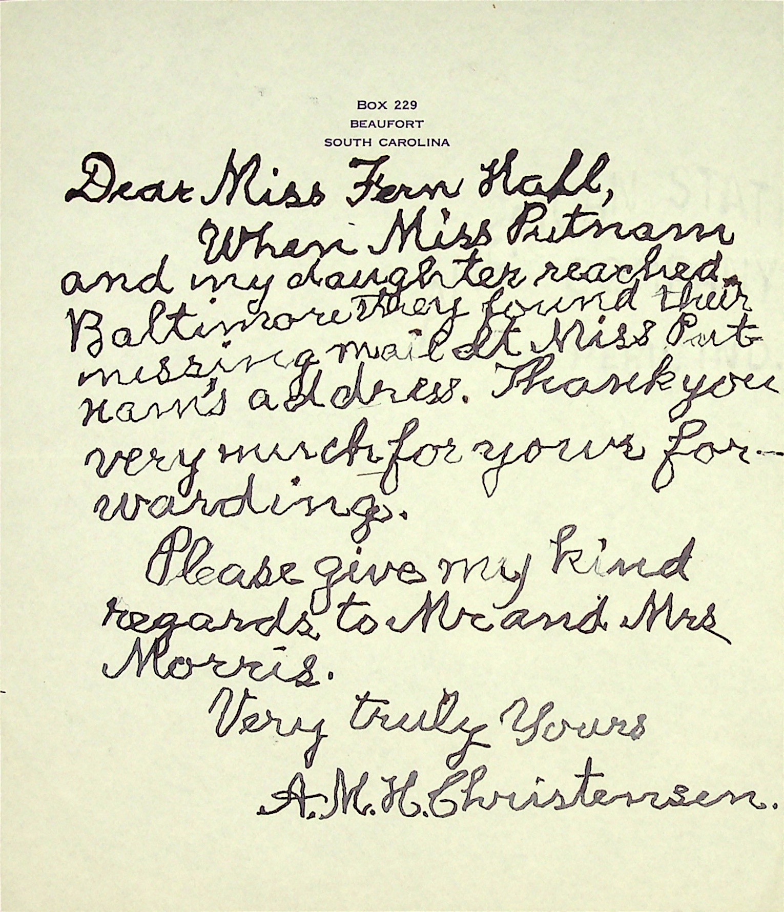 [No date] To Mrs. Fern Hall from A.M.H. Christensen, thanking her for forwarding her mail.