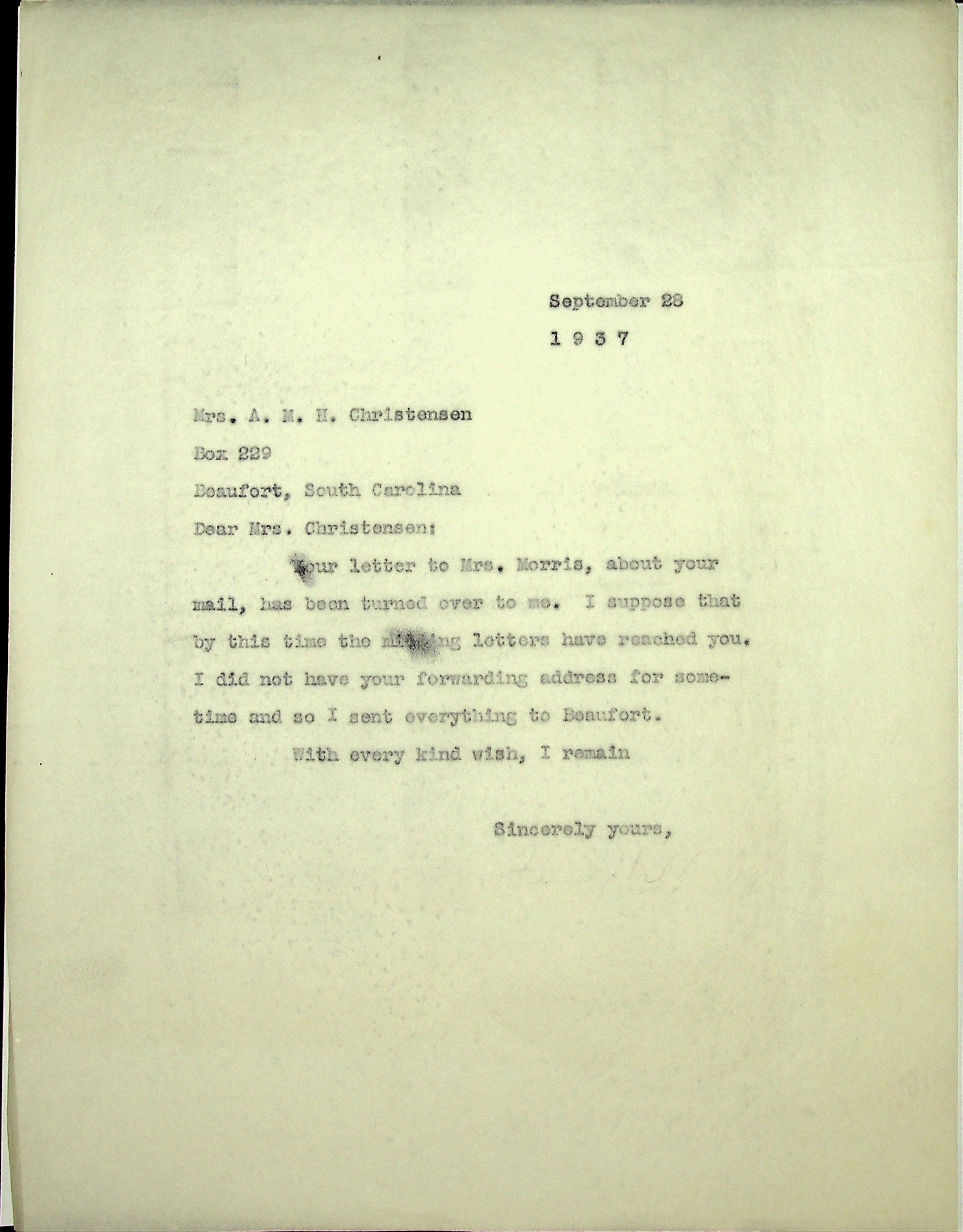 September 28, 1937. To Mrs. A.M.H. Christensen in Greenville, SC., from [unsigned, likely Glyn Morris].