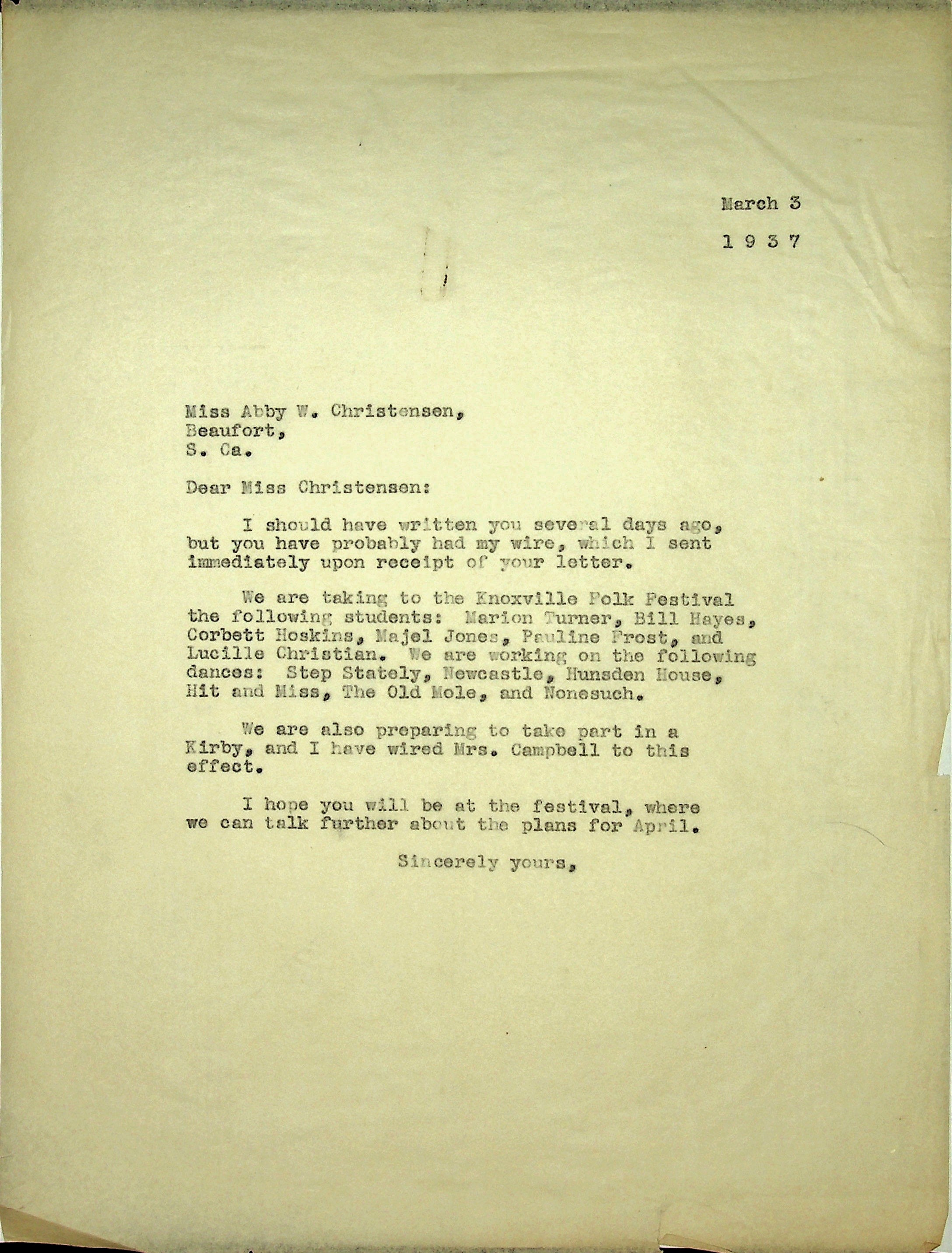 March 4, 1937. To Morris from Christensen. Concerning the program for the Knoxville Folk Festival, “…when a Pine Mt. team goes to meet other dance teams at a folk festival it represents not only Pine Mt. but also English folk dancing as passed on by me.” Comments on upcoming May Day.