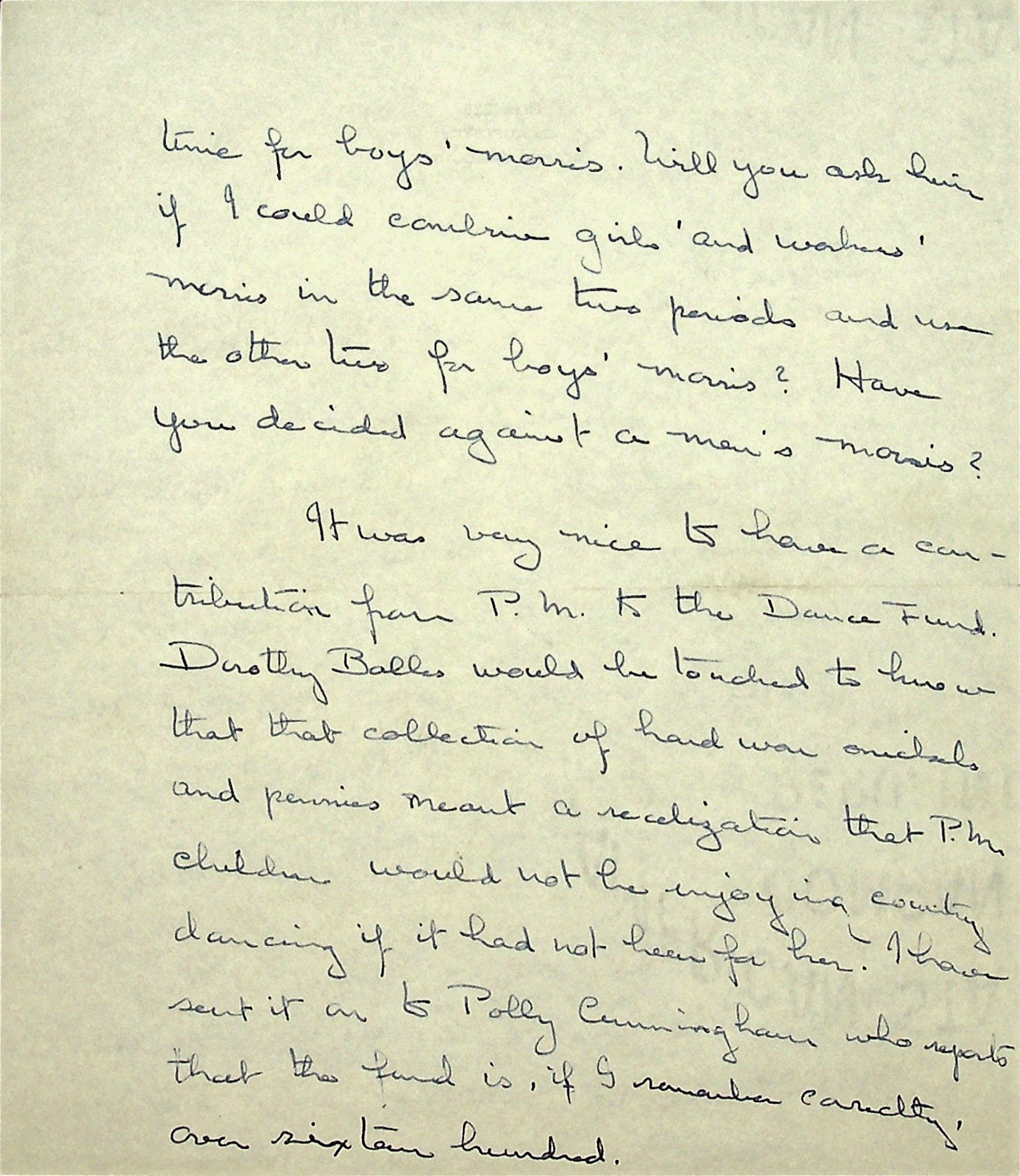 March 24, 1937. To Christensen from [unsigned, likely Morris]. Sends information from Mr. Dodd; a check for the [Dorothy] Bolles Fund. “…children would not be enjoying country dancing if it had not been for her.”