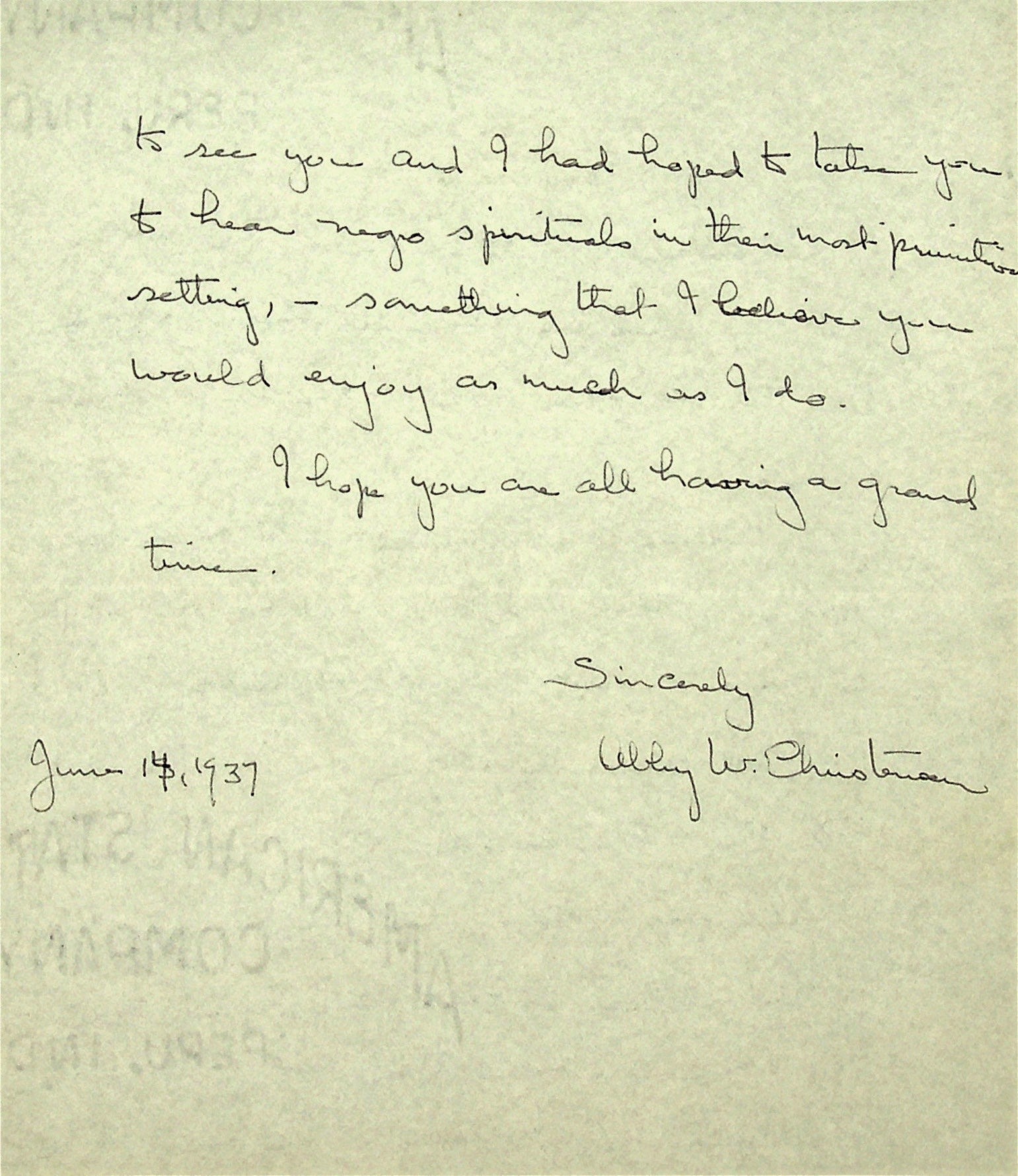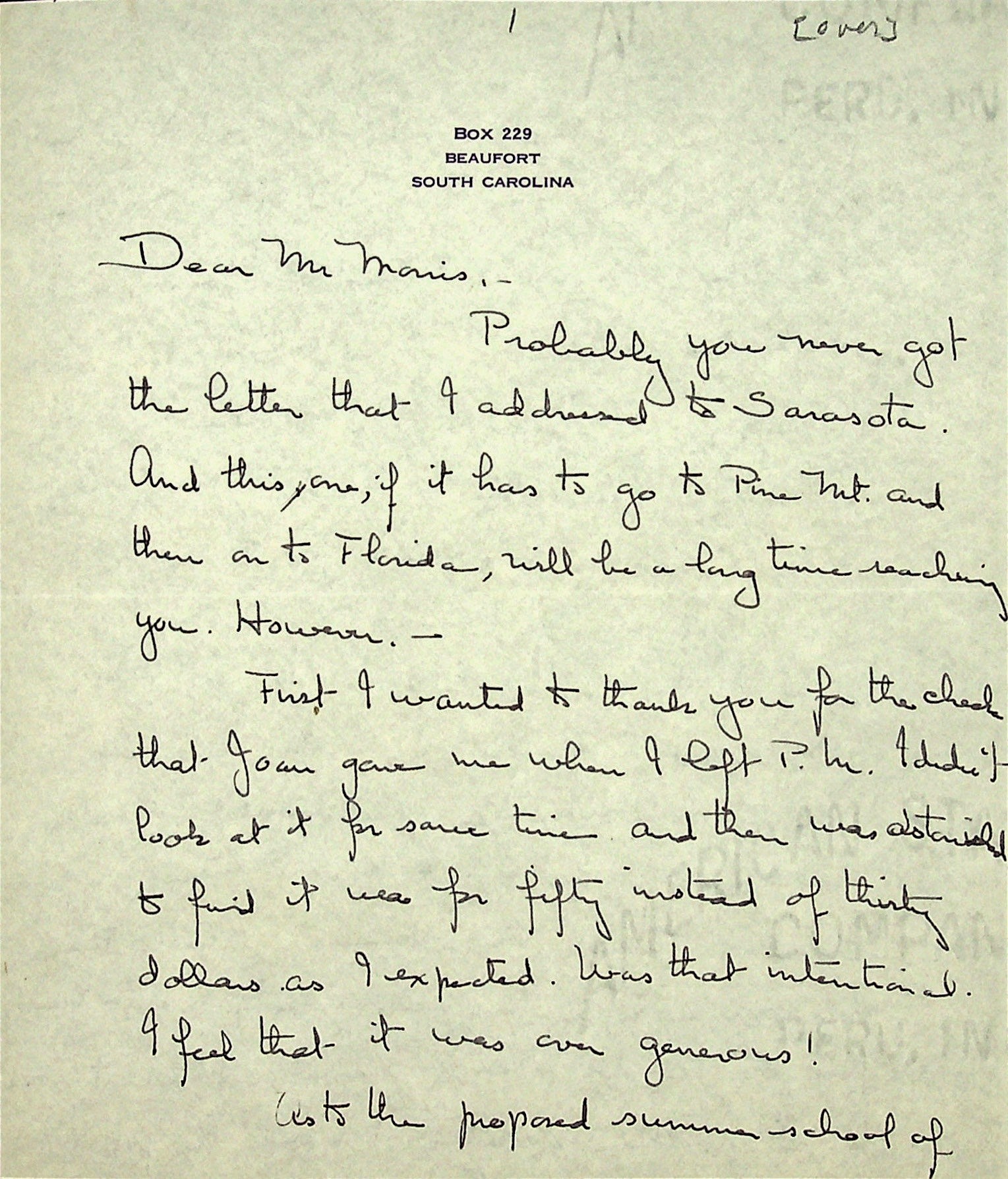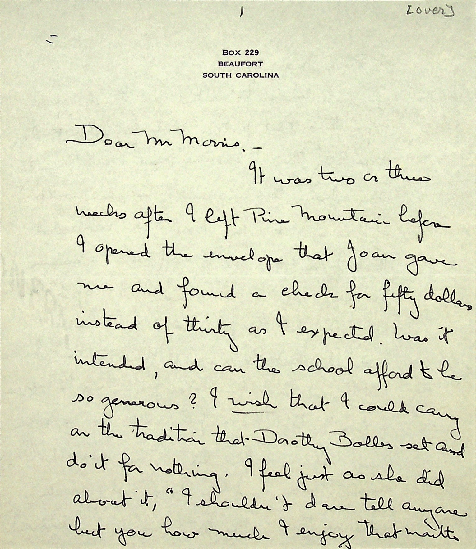 June 4, 1937. To Morris from Christensen. Received check for $50 from PMSS for dance instruction. Cannot teach at PMSS summer school, “for want of a musician.” Asks about Morris’s visit to Sarasota, FL; invites the Morris family to visit her at Edisto Beach; asks whether her mother, Miss [Sally] Putnam and herself can board at PMSS this summer.
