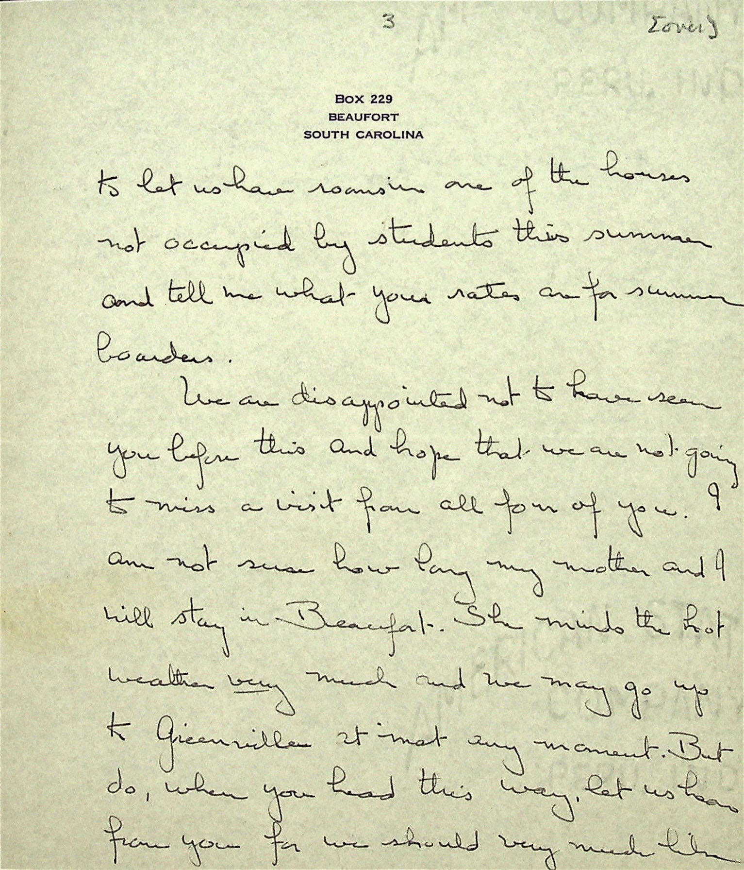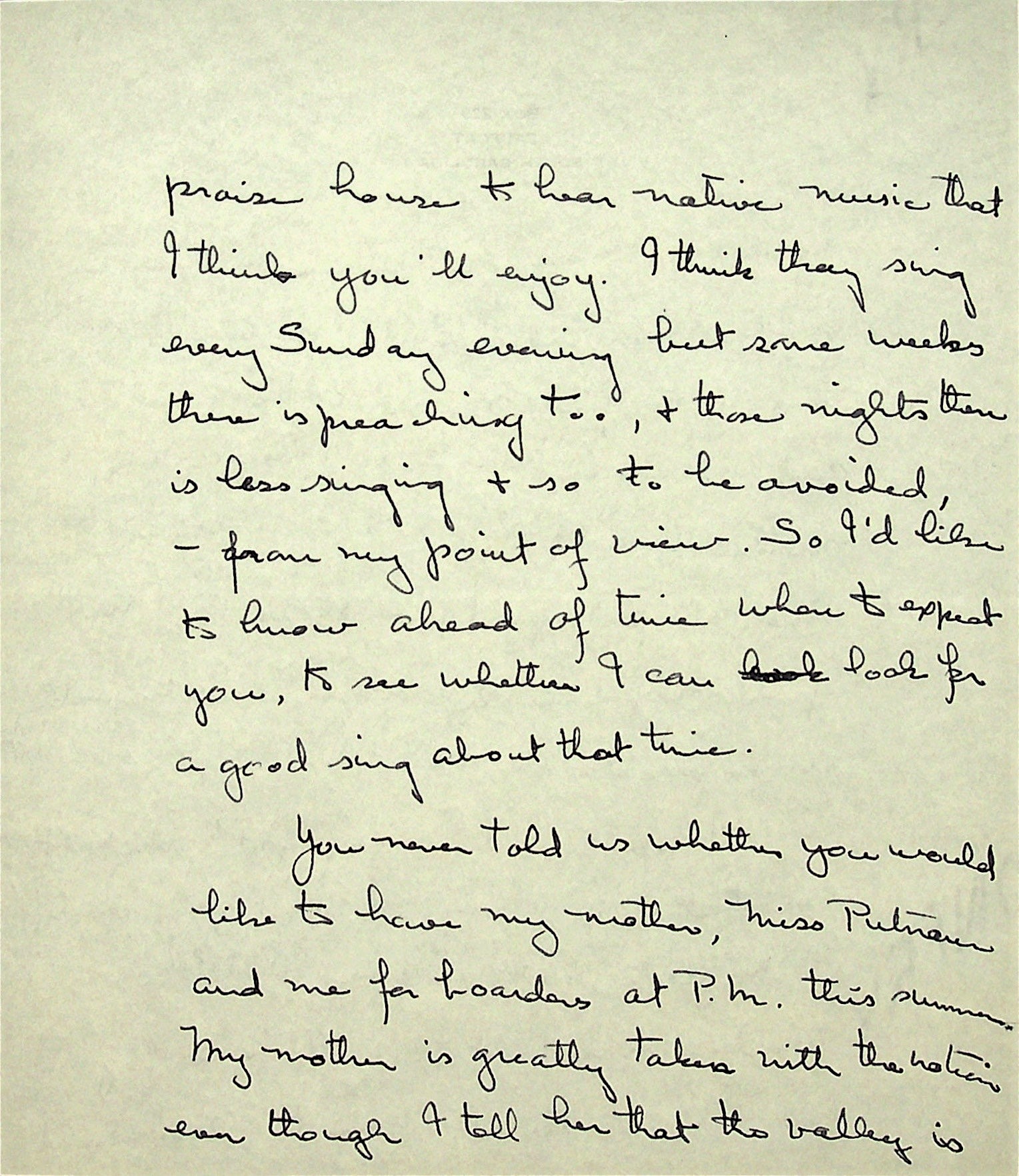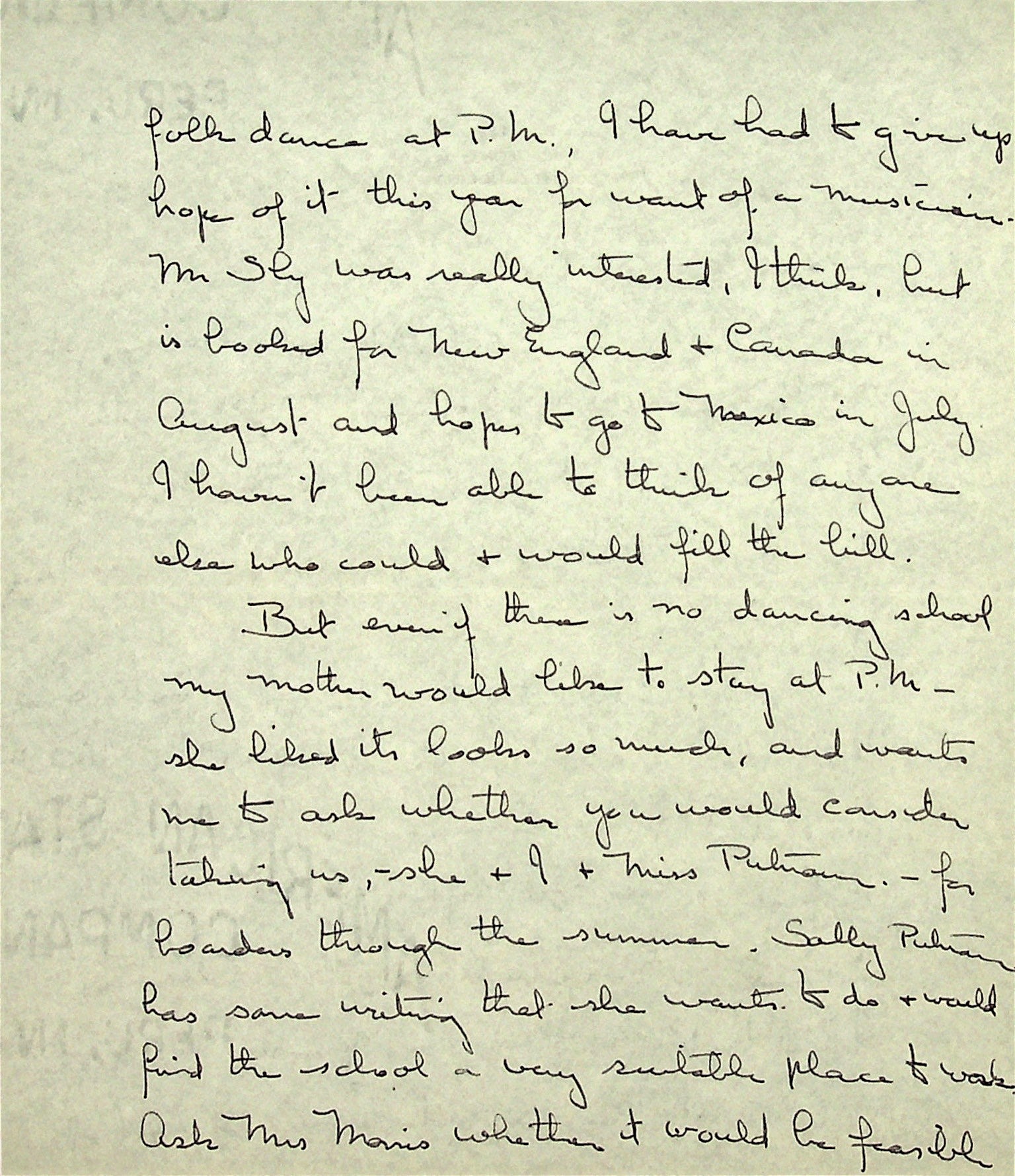 June 4, 1937. To Morris from Christensen. Received check for $50 from PMSS for dance instruction. Cannot teach at PMSS summer school, “for want of a musician.” Asks about Morris’s visit to Sarasota, FL; invites the Morris family to visit her at Edisto Beach; asks whether her mother, Miss [Sally] Putnam and herself can board at PMSS this summer.