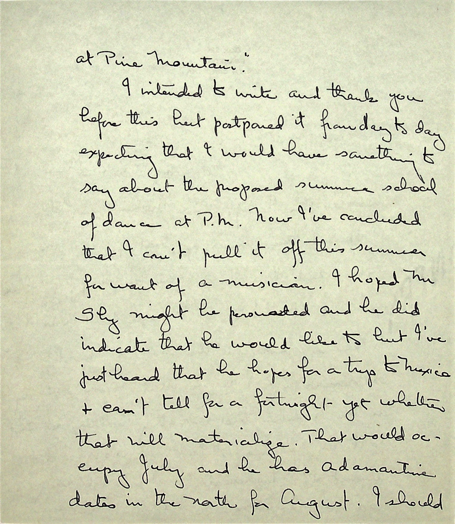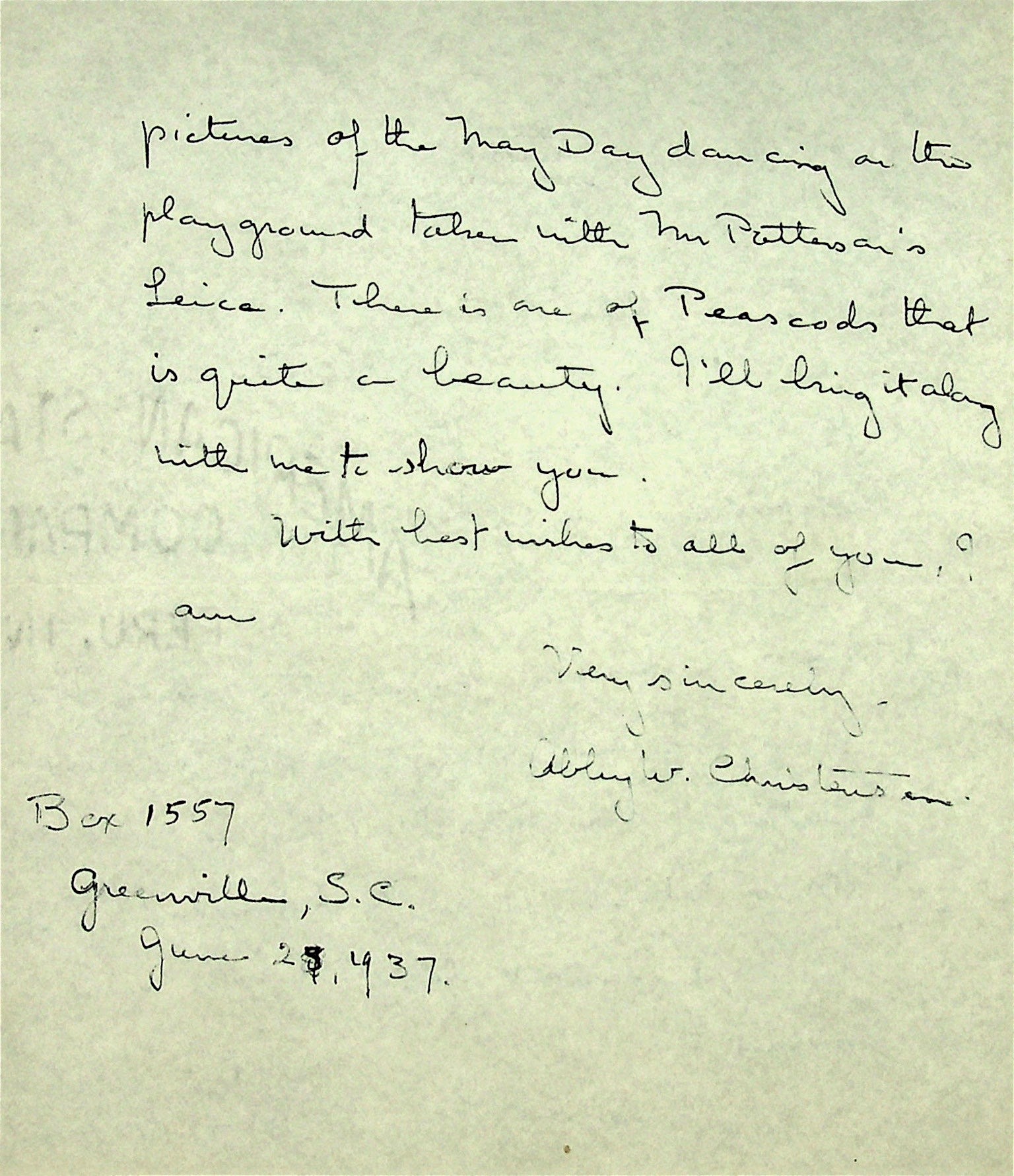 June 27, 1937. To Morris from Christensen in Greenville, SC. “I’ve just been looking at pictures of the May Day dancing on the playground taken with Mr. Patterson’s Leica. There is one of Peascods that is quite a beauty.”