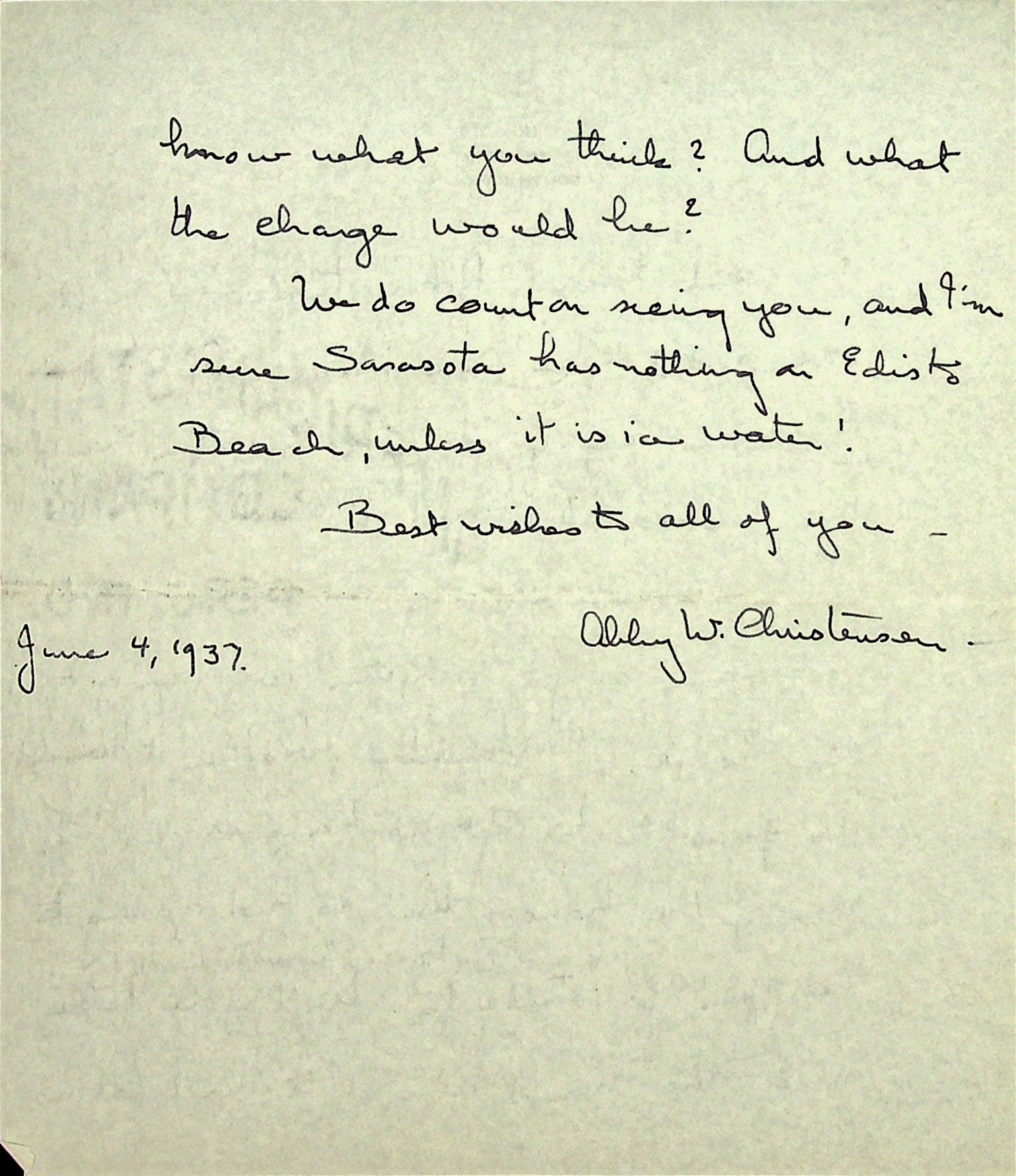 June 14, 1937. To Morris from Christensen. She repeats the topics in her June 4, 1937, letter in case he didn’t receive it in Sarasota, FL.