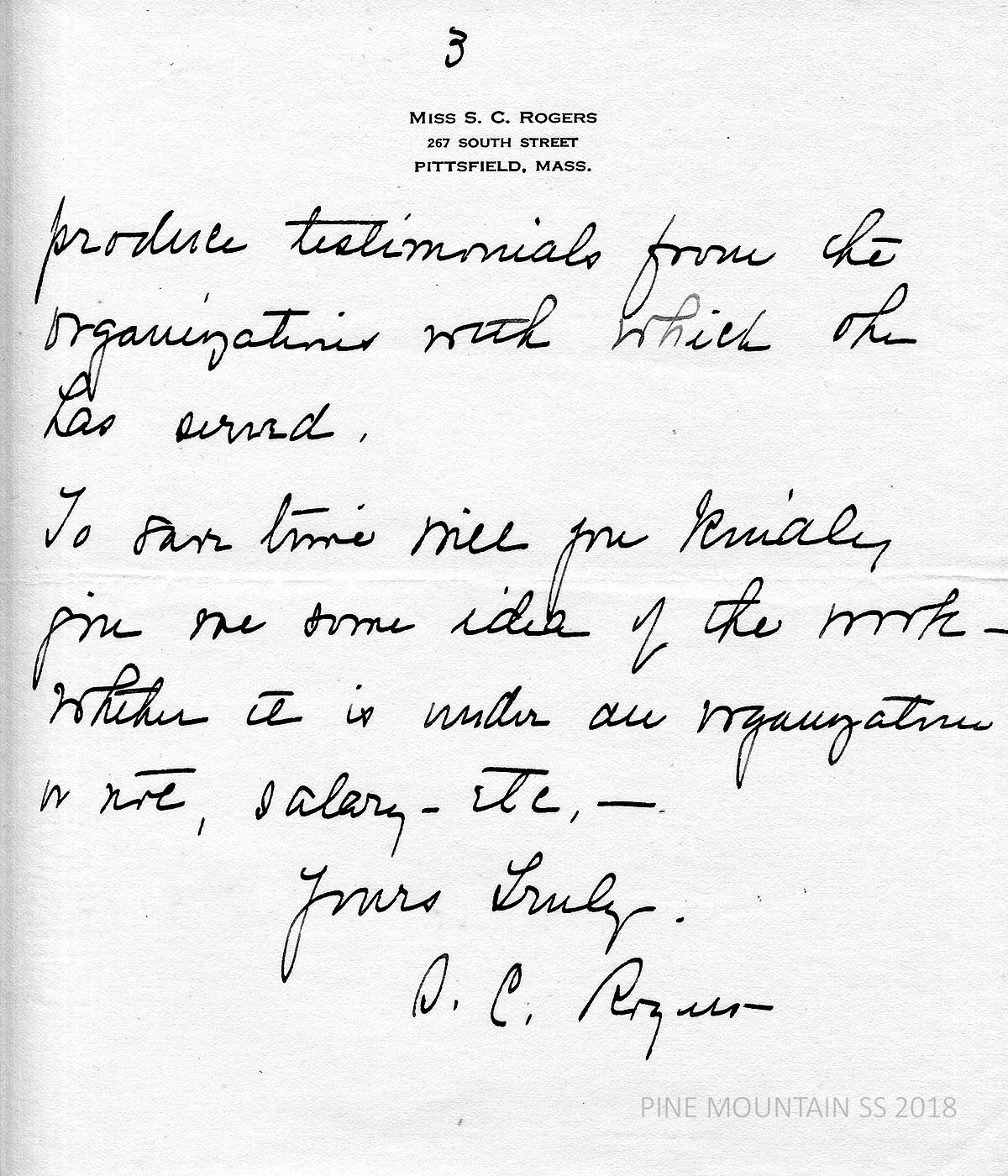 [withington_a_002.jpg] January 20, 1924. Handwritten 3-page note to [no salutation] from Miss S.C. Rogers of Pittsfield, MA. Saw notice in Journal A.M.A. and recommends “a person who might like that kind of work.” [002a] Page 2: Describes her credentials. [002b] Page 3: Requests more information about the work.