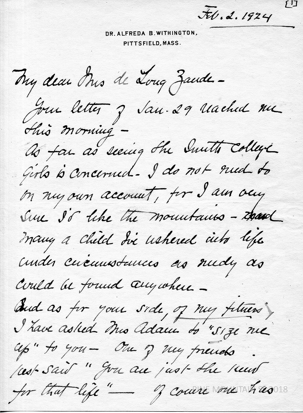 [withington_a_009.jpg] February 2, 1924. Handwritten 2-page letter to Zande from Caroline H. Adam (Mrs. William L. Adam) in Pittsfield, MA. Describes Dr. Withington as “attractive personally, that is she is pleasant and companionable and gives one a sense of reserve strength equal to any emergency.” Describes Withington’s experience, good judgment, reliability. “She loves the plain people and they love her.” Relates examples of her work in Labrador and France. “I’ve known Dr. Withington at least twenty-four years. She has educated three nephews and a niece….” [009a] Page 2. “She is a woman of refined and good taste but so-called refinements are not essential to her. She is the kind of person you and Miss Pettit are.”