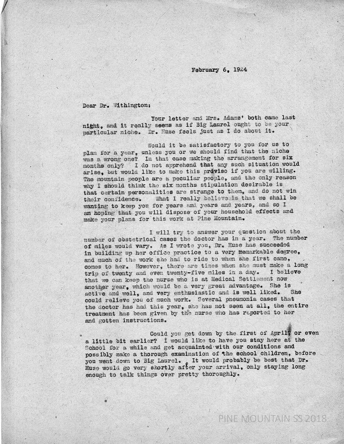 [withington_a_012.jpg] February 6, 1924. Carbon copy of unsigned typewritten letter to Withington from EZ (Ethel Zande). Both Zande and Huse feel that “Big Laurel ought to be your particular niche.” Asked to plan for a year or 6 months if the “niche” is the wrong one. “The mountain people are a peculiar people, and the only reason why I should think the six months stipulation desirable is that certain personalities are strange to them, and do not win their confidence. What I really believe is that we shall be wanting to keep you for years and years and years…” Answers questions about number of cases per year and miles traveled; will keep the nurse another year as help. Asks Withington to arrive by first of April or earlier; Huse will leave soon after. [011a] Page 2. Zande is glad Withington agrees to a salary of $1500. Expresses appreciation for Mrs. Adam’s letter; “We are certainly fortunate in having someone like her who knows both Miss Pettit and me, to introduce you to us.”