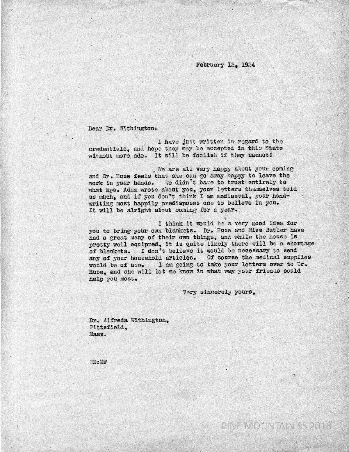 [withington_a_016.jpg] February 12, 1924. Carbon copy of unsigned typewritten letter to Withington from EZ (Ethel Zande). Informs Withington that she wrote to the State about accepting her credentials. “… if you don’t think I am medieval, your handwriting most happily predisposes one to believe in you. …” Agrees to one-year employment. Advises what to bring; will consult Dr. Huse about medical equipment needs.