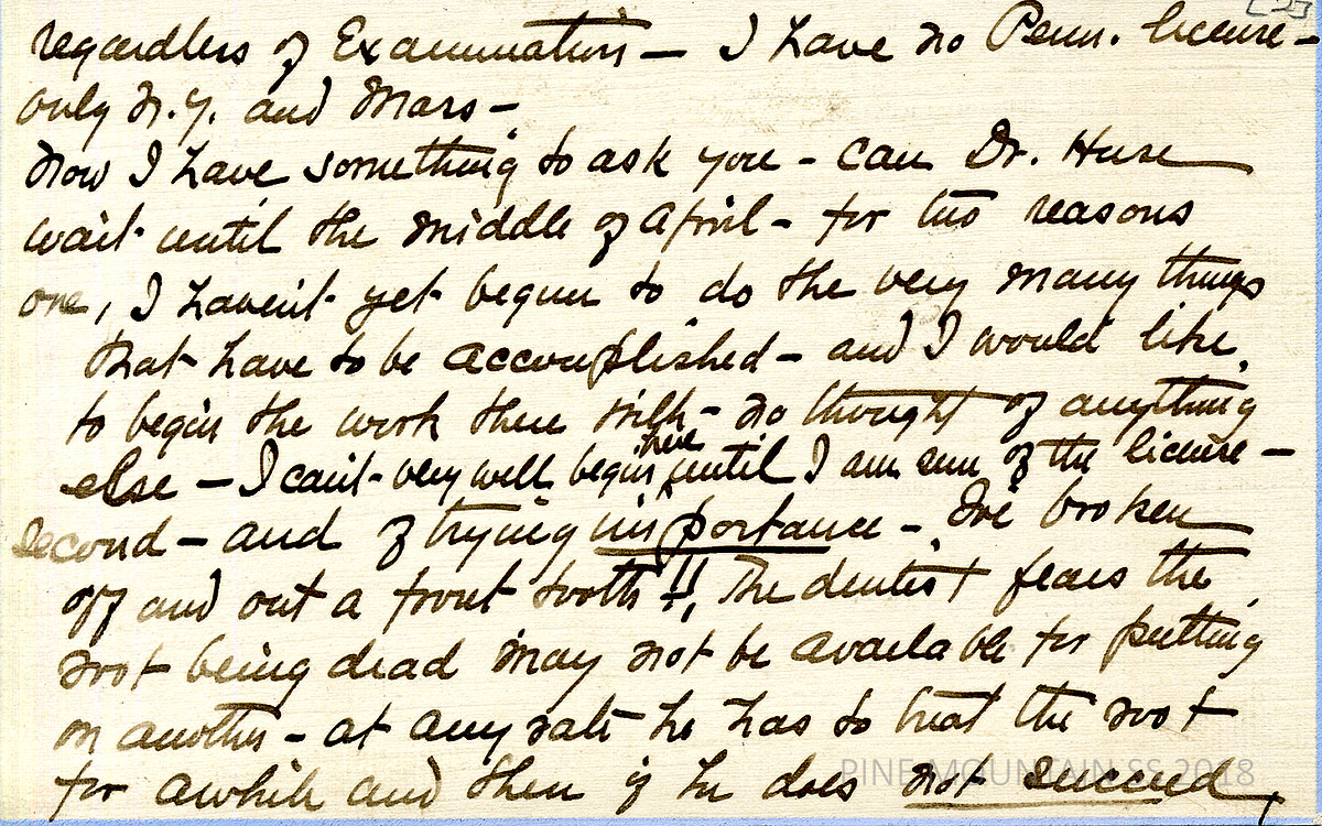 [withington_a_021.jpg] [n.d.] Handwritten 4-page letter to Zande from Withington. Received Zande’s post card message that Kentucky Board will give her a license. Mentions reciprocity rules in PA… [021a] Page 2. Asks if Dr. Huse can wait to leave PMSS until mid-April, because she has much preparation to do, wishes to be sure about the license, and needs to have dental work on a broken tooth. [020b] Page 3. Asks about clothing and weather needs,…[020c] Page 4. … access to a truck, sending and storing a trunk of clothing, need for her Ford coupe.