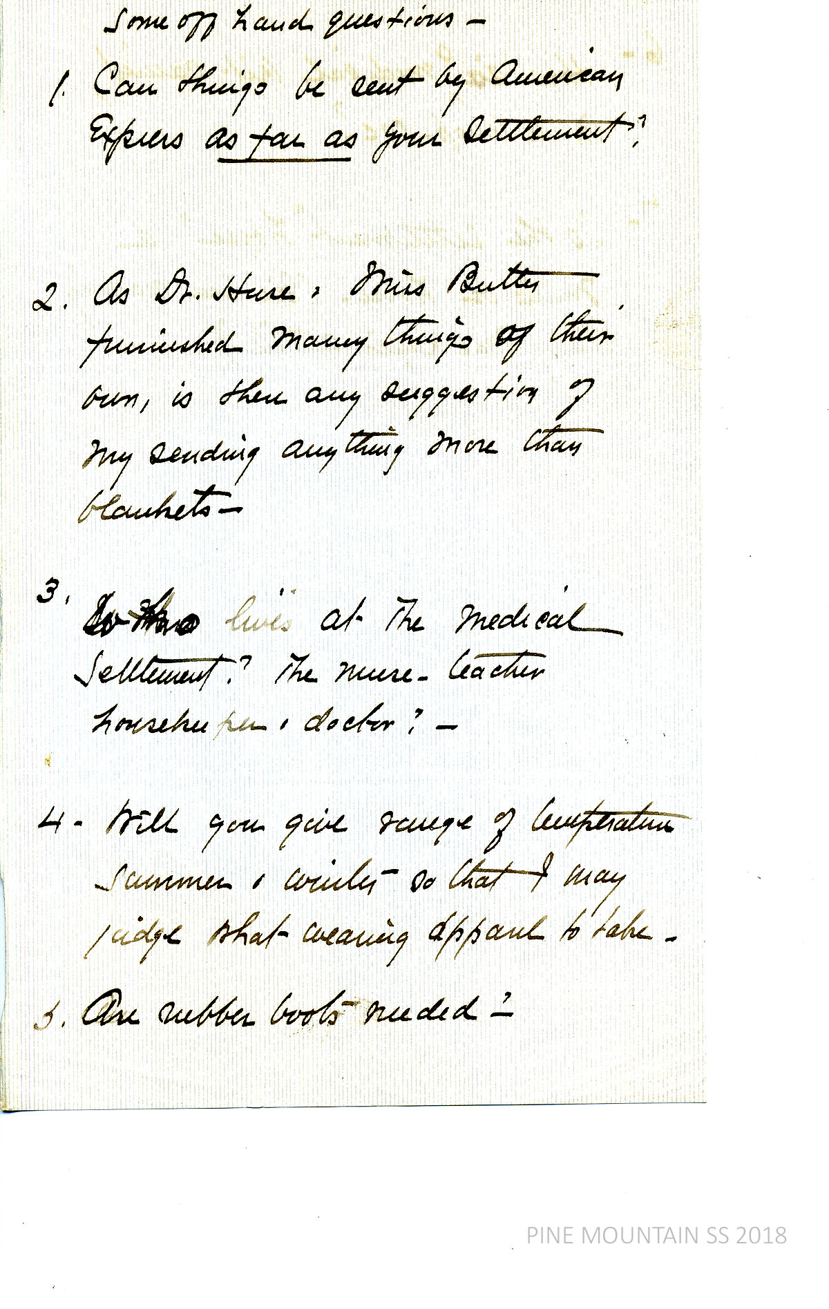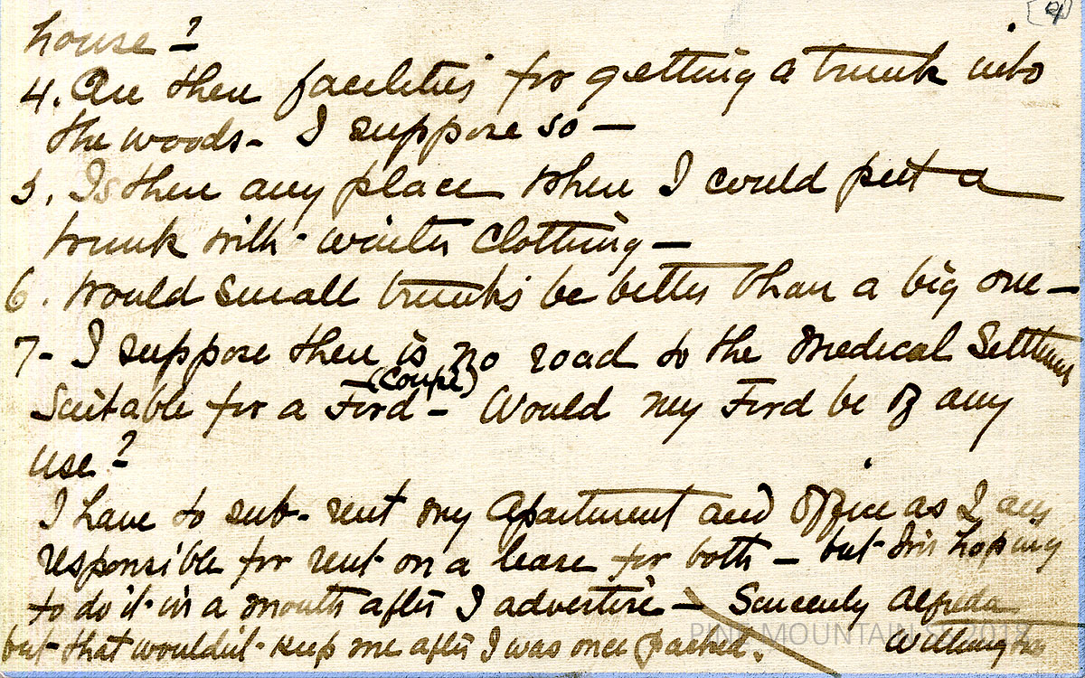 [027b] Page 3. [n.d., no salutation] Handwritten 2-page note from Withington. “Some off hand questions” Can she send things by American Express? What else to send besides things furnished by Dr. Huse and Miss Butler? Who lives at the Medical Settlement: nurse, teacher, housekeeper, doctor? Summer and winter temperatures? Need rubber boots? [027c] Page 4. “How is a medical kit carried, in a knap-sac? Is the settlement “horse” a mule or horse[?] (I’ve been reading Perry MacKaye’s article.)