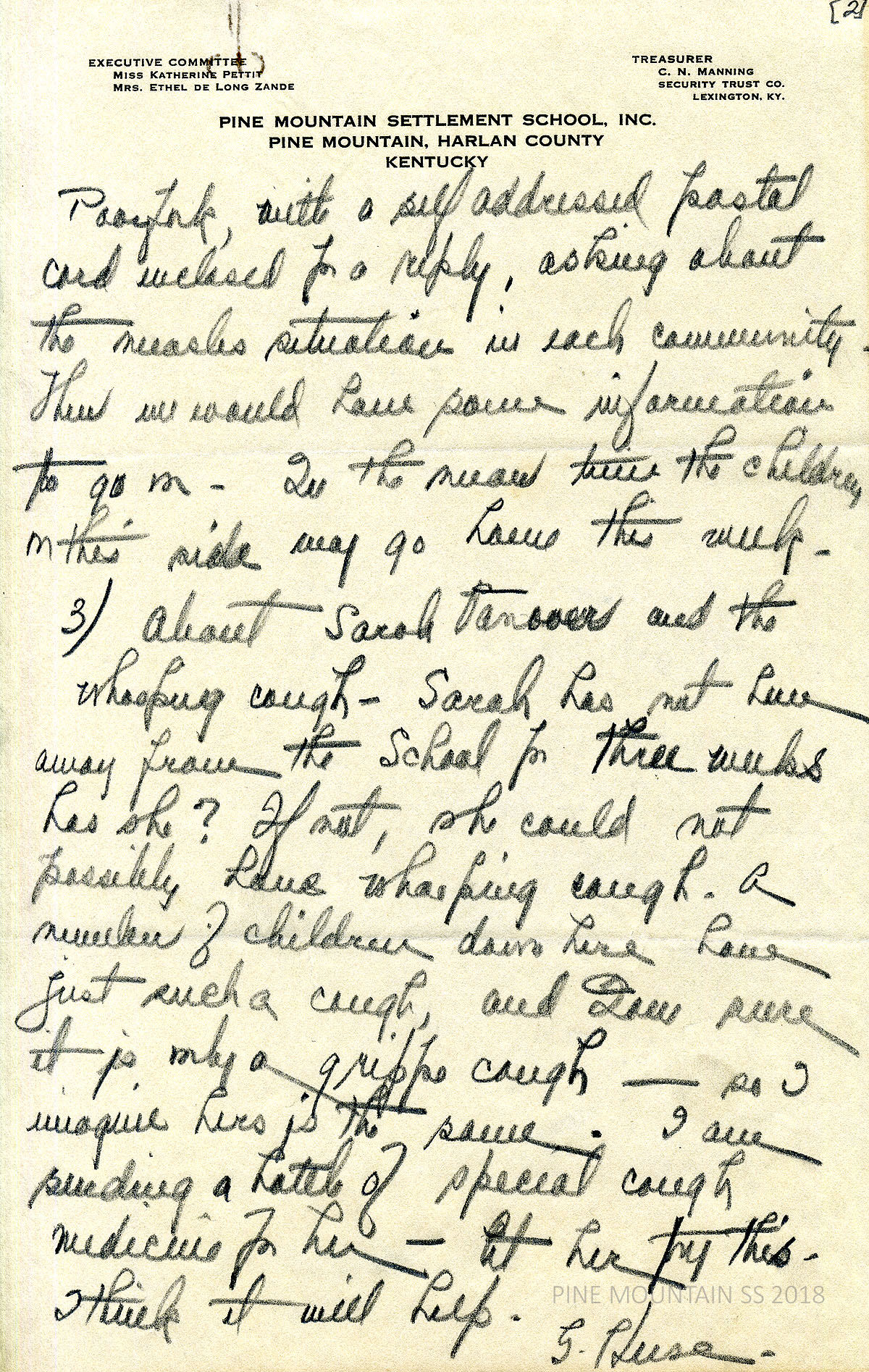 [withington_a_045.jpg] April 11, 1924. Carbon copy of unsigned typewritten letter to Withington likely from Zande. Use Western Union, Harlan, Ky., for telegraphs, which then mails messages to PMSS. “The office sends in any telegram containing a message of death, for a worker at the school, by special messenger on horseback.” Mrs. Alderman will be coming to PMSS. Assures that Miss Vallette, the nurse, may be able to do most of the outside work for awhile which will allow Withington to rest. “We are afraid we are in for a measles epidemic in this neighborhood. Of course, we are doing everything we can to keep it out of the school, but there are two cases nearby, and it looks as if there would be more.”