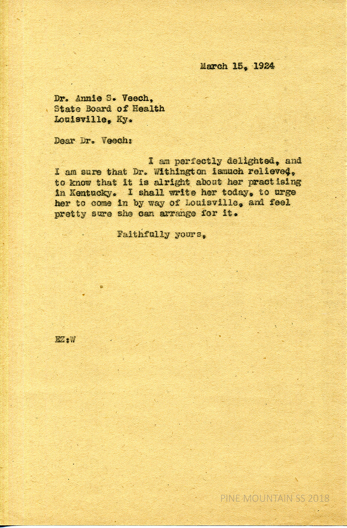 [withington_a_033.jpg] March 15, 1924. Carbon copy of unsigned typewritten letter to Withington from EZ (Zande). Informed Withington of Dr. Veech’s news and encourages her to visit Louisville en route to PMSS. “… [Y]ou can get a through sleeper from Louisville to Laden where you get off to cross the mountain. …[I]f you could meet with [the State Board of Health] and talk with them, I think it would help the harmony in which we work, though you will find that they do not always have our point of view about work here.”