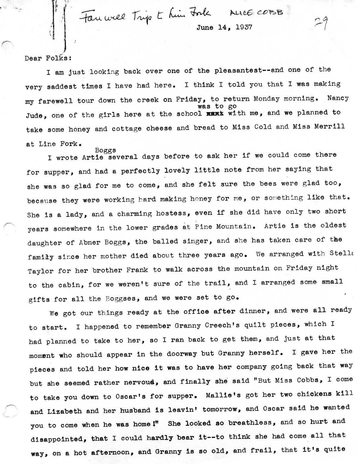 On June 14, 1937, Alice Cobb wrote to her “Folks” [It is unclear just who “Folks” represent]. In the letter she details how she made a nostalgic trip to say her “good-byes” to the community where she had worked for many years while a staff member at Pine Mountain Settlement School. She traveled first to Little Laurel, Big Laurel and Turkey Fork communities and then on to Line Fork where her service work took place. Her account is filled with memories and sadness at leaving so many familiar families and the familiar landscapes where she had experienced adventures that were often not for the faint of heart.