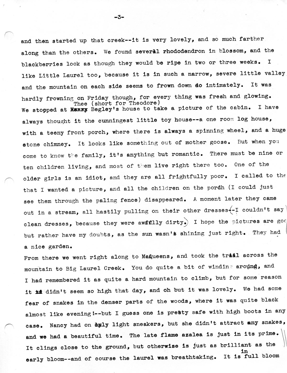 …and then started up that creek — it is very lovely, and so much farther along than the others. We found several rhododendrons in blossom, and the blackberries look as though they would be ripe in two or three weeks. I like Little Laurel too, because it is in such a narrow, severe little valley and the mountain on each side seems to frown down so intimately. It was hardly frowning on Friday though, for every thing was fresh and glowing. We stopped at Thee (short for Theodore) Begley‘s house to take a picture of the cabin. I have always thought it the cunningest little toy house — a one room log house, with a teeny front porch, where there is always a spinning wheel, and a huge stone chimney. It looks like something out of mother goose. But when you come to know the family, it’s anything but romantic. There must be nine or ten children living, and most of them live right there too. One of the older girls is an idiot, and they are all frightfully poor. I called to the [truncated] that I wanted a picture, and all the children on the porch (I could just see them through the paling fence) disappeared. A moment later they came out in a stream, all hastily pulling on their other dresses — (I couldn’t say clean dresses, because they were awfully dirty.) I hope the pictures are good but rather have my doubts, as the sun wasn’s shining just right. They had a nice garden.