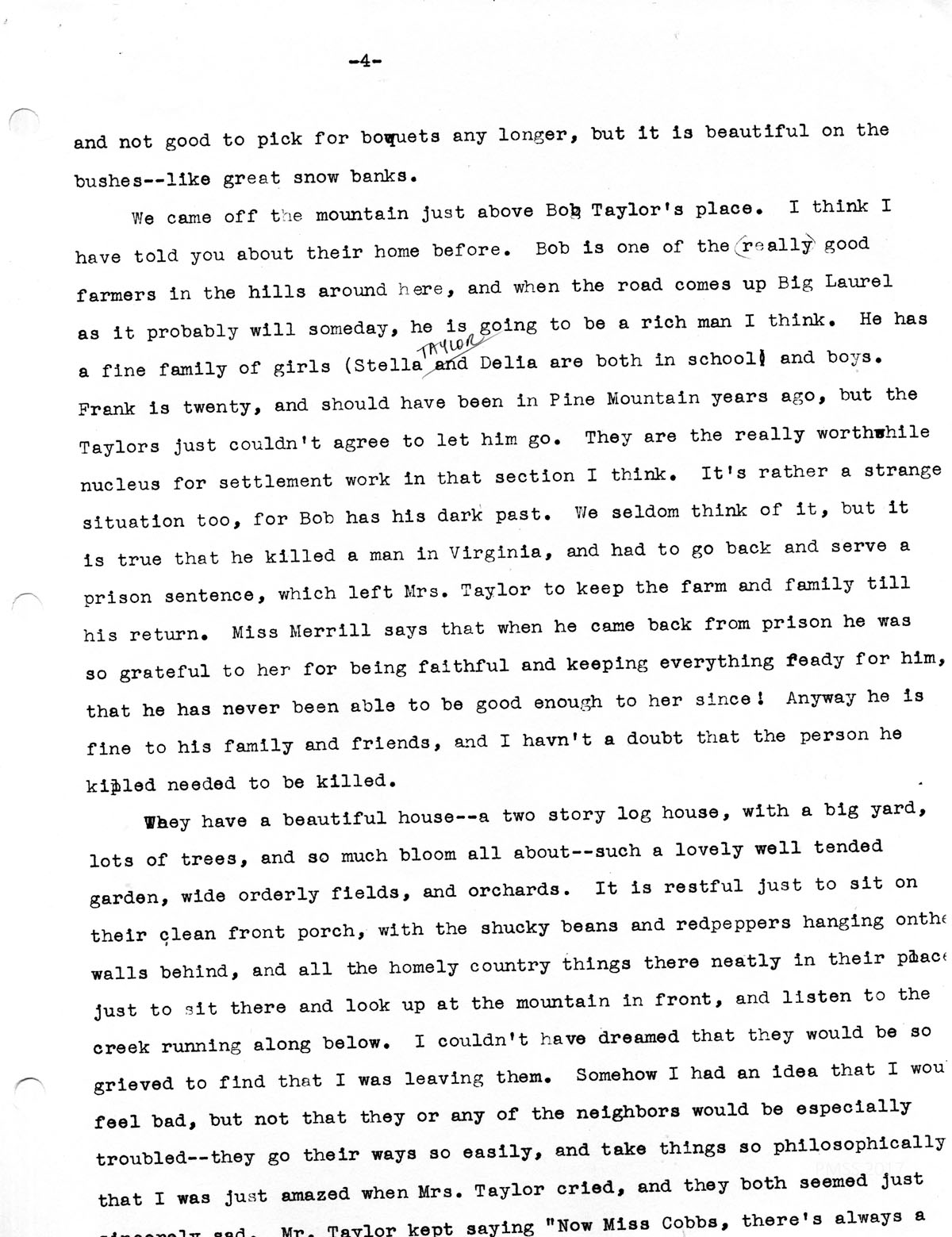 They have a beautiful house — a two story log house, with a big yard, lots of trees, and so much bloom all about — such a lovely well tended garden, wide orderly fields, and orchards. It is restful just to sit on their clean front porch, with the shucky beans and red peppers hanging on the walls behind, and all the homely country things there neatly in their place, just to sit there and look up at the mountain in front, and listen to the creek running along below. I couldn’t have dreamed that they would be so grieved to find that I was leaving them. Somehow I had an idea that I would feel bad, but not that they or any of the neighbors would be especially troubled — they go their ways so easily, and take things so philosophically that I was just amazed when Mrs. Taylor cried, and they both seemed just [truncated] sad. Mr. Taylor kept saying “Now Miss Cobbs, there’s always a…
