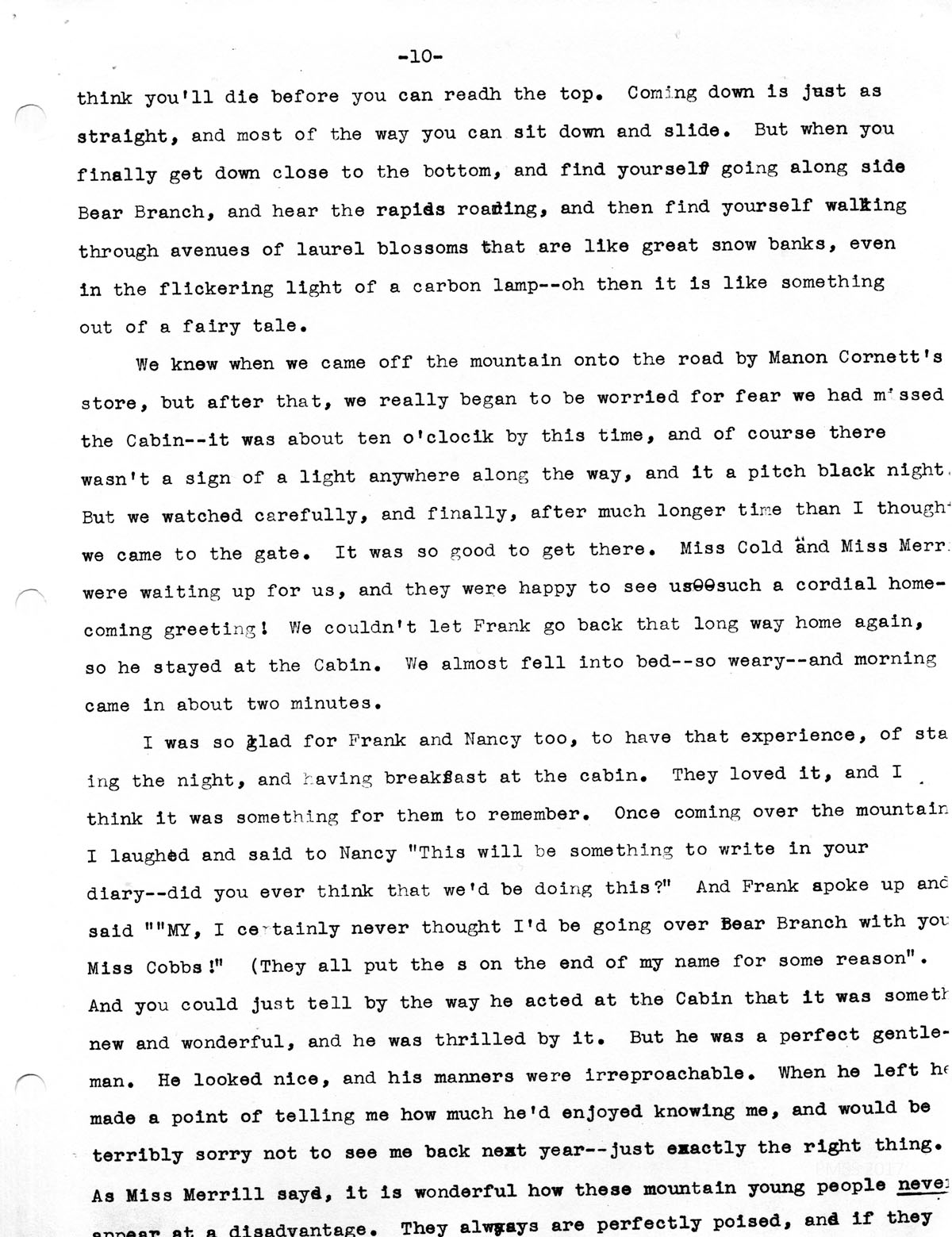 I was so glad for Frank and Nancy too, to have that experience, of staying the night, and having breakfast at the cabin. They loved it, and I think it was something for them to remember. Once coming over the mountain I laughed and said to Nancy, “This will be something to write in your diary — did you ever think that we’d be doing this?” And Frank spoke up and said, “My, I certainly never thought I’d be going over Bear Branch with you Miss Cobbs!” (They all put the s on the end of my name for some reason.) And you could just tell by the way he acted at the Cabin that it was something new and wonderful, and he was thrilled by it. But he was a perfect gentleman. He looked nice, and his manners were irreproachable. When he left he made a point of telling me how much he’d enjoyed knowing me, and would be terribly sorry not to see me back next year — just exactly the right thing. As Miss Merrill says, it is wonderful how these mountain young people never appear at a disadvantage. They always are perfectly poised, and if they…